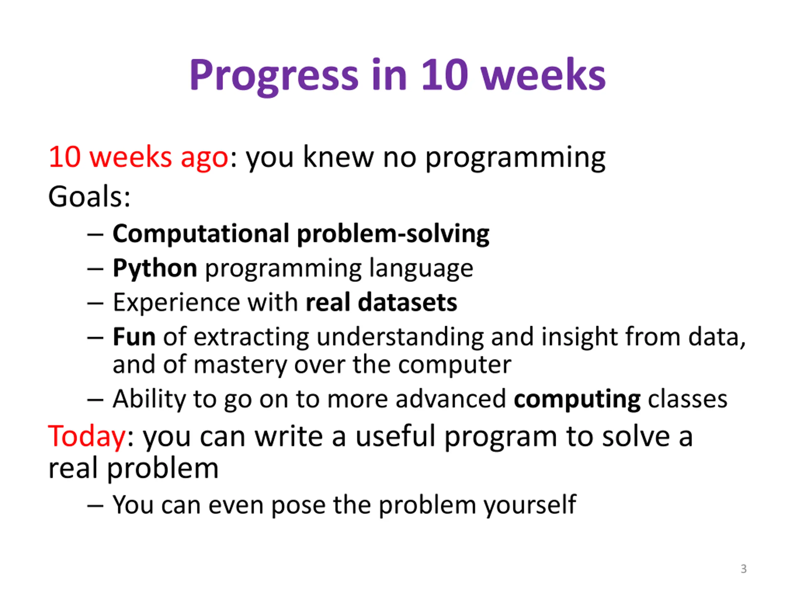Progress in 10 weeks 10 weeks ago: you knew no programming Goals: Computational problem-solving Python programming language Experience with real datasets Fun of extracting understanding and insight from data, and of mastery over the computer Ability to go on to more advanced computing classes Today: you can write a useful program to solve a real problem You can even pose the problem yourself 3