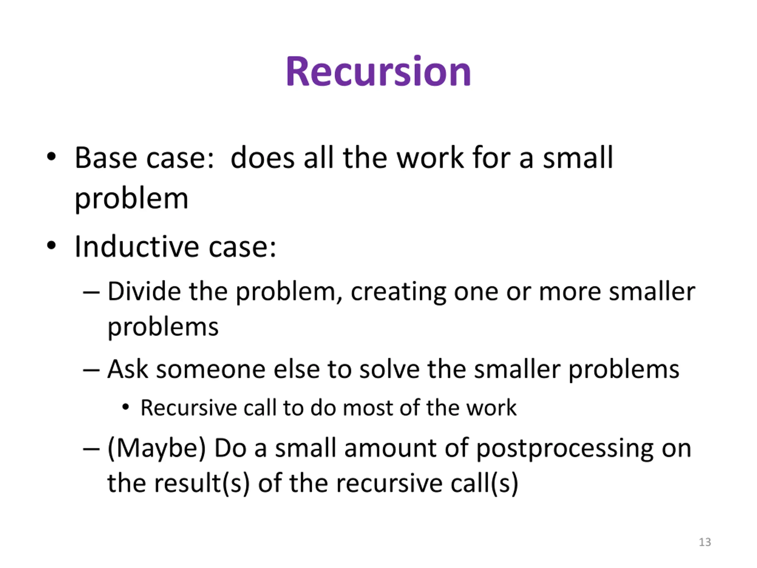 Recursion Base case: does all the work for a small problem Inductive case: Divide the problem, creating one or more smaller problems Ask someone else to solve the smaller problems Recursive call to do most of the work (Maybe) Do a small amount of postprocessing on the result(s) of the recursive call(s) 13