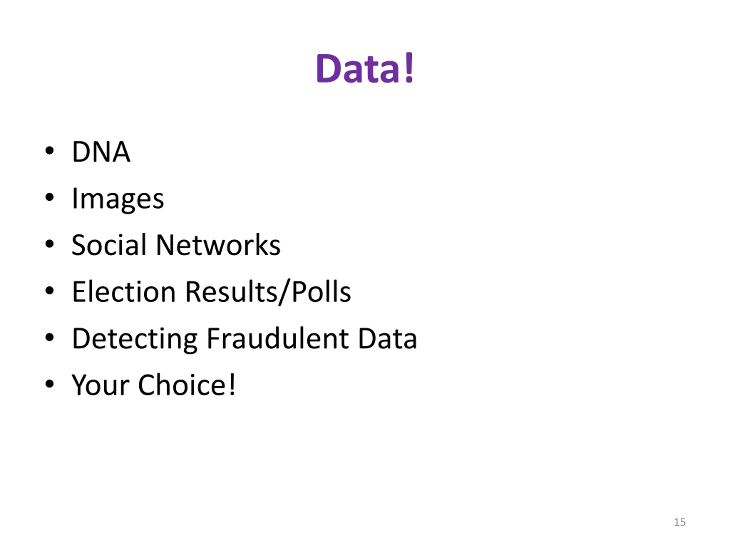 Data! DNA Images Social Networks Election Results/Polls Detecting Fraudulent Data Your Choice! 15
