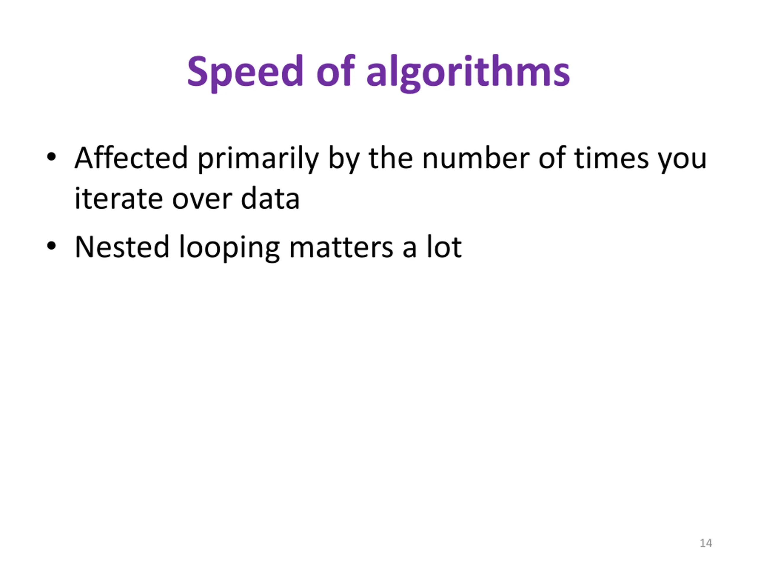 Speed of algorithms Affected primarily by the number of times you iterate over data Nested looping matters a lot 14