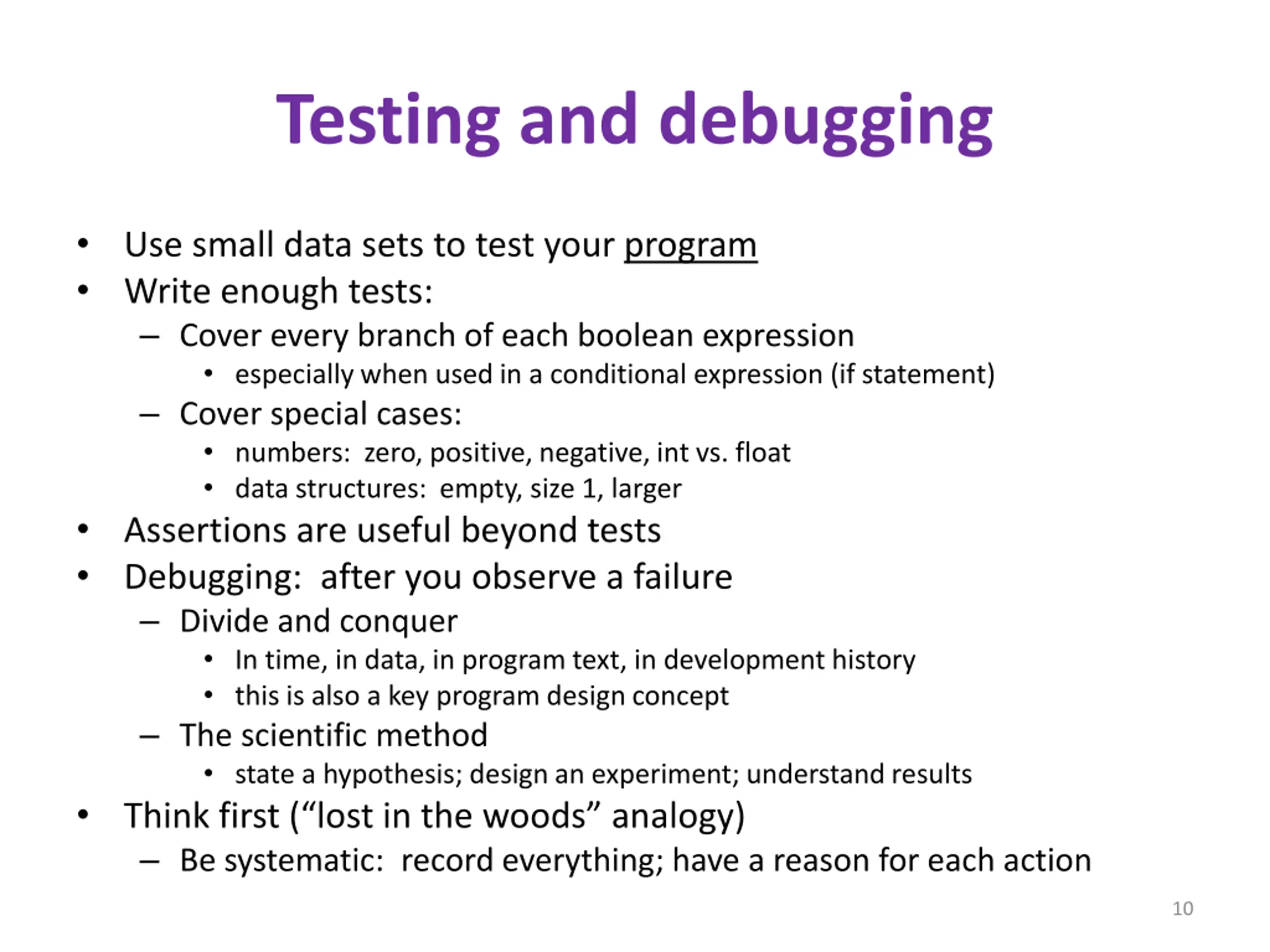 Testing and debugging Use small data sets to test your program Write enough tests: Cover every branch of each boolean expression especially when used in a conditional expression (if statement) Cover special cases: numbers: zero, positive, negative, int vs. float data structures: empty, size 1, larger Assertions are useful beyond tests Debugging: after you observe a failure Divide and conquer In time, in data, in program text, in development history this is also a key program design concept The scientific method state a hypothesis; design an experiment; understand results Think first ( lost in the woods analogy) Be systematic: record everything; have a reason for each action 10