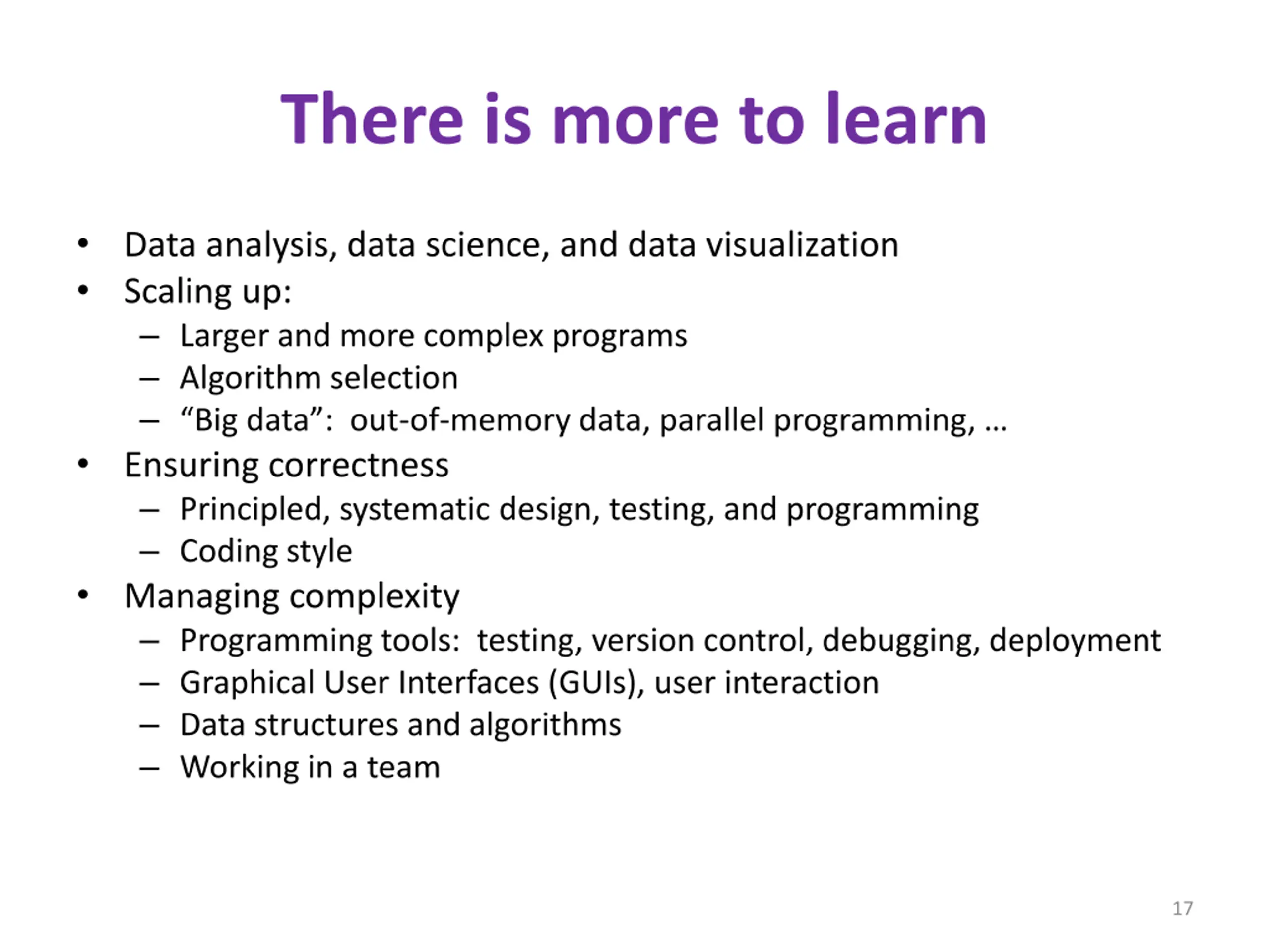 There is more to learn Data analysis, data science, and data visualization Scaling up: Larger and more complex programs Algorithm selection Big data : out-of-memory data, parallel programming, Ensuring correctness Principled, systematic design, testing, and programming Coding style Managing complexity Programming tools: testing, version control, debugging, deployment Graphical User Interfaces (GUIs), user interaction Data structures and algorithms Working in a team 17
