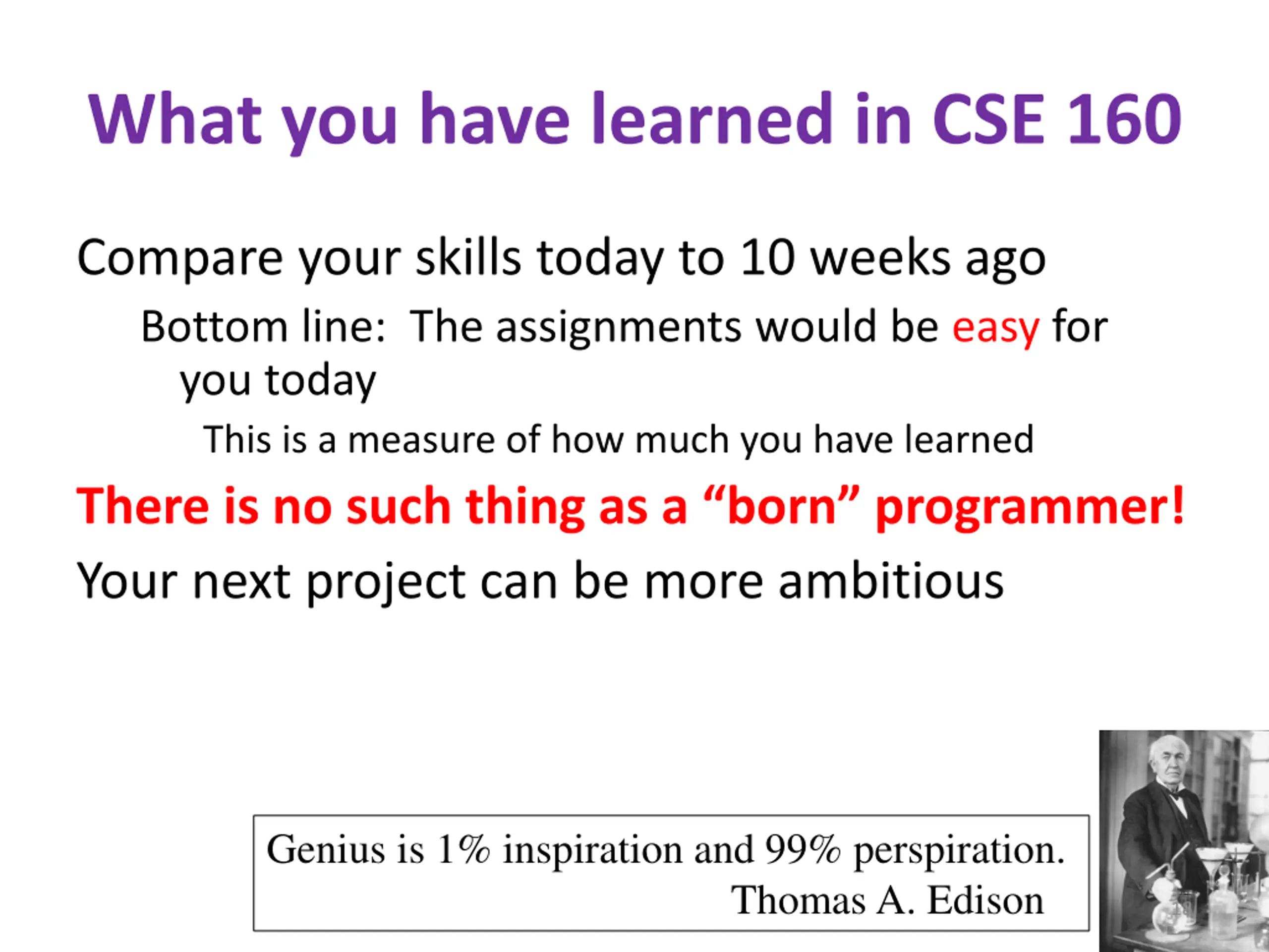 What you have learned in CSE 160 Compare your skills today to 10 weeks ago Bottom line: The assignments would be easy for you today This is a measure of how much you have learned There is no such thing as a born programmer! Your next project can be more ambitious Genius is 1% inspiration and 99% perspiration. Thomas A. Edison 18