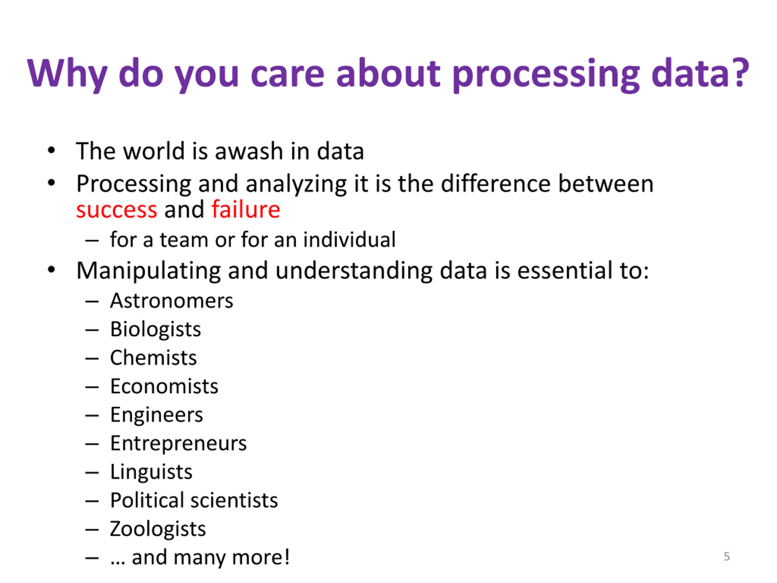 Why do you care about processing data? The world is awash in data Processing and analyzing it is the difference between success and failure for a team or for an individual Manipulating and understanding data is essential to: Astronomers Biologists Chemists Economists Engineers Entrepreneurs Linguists Political scientists Zoologists and many more! 5