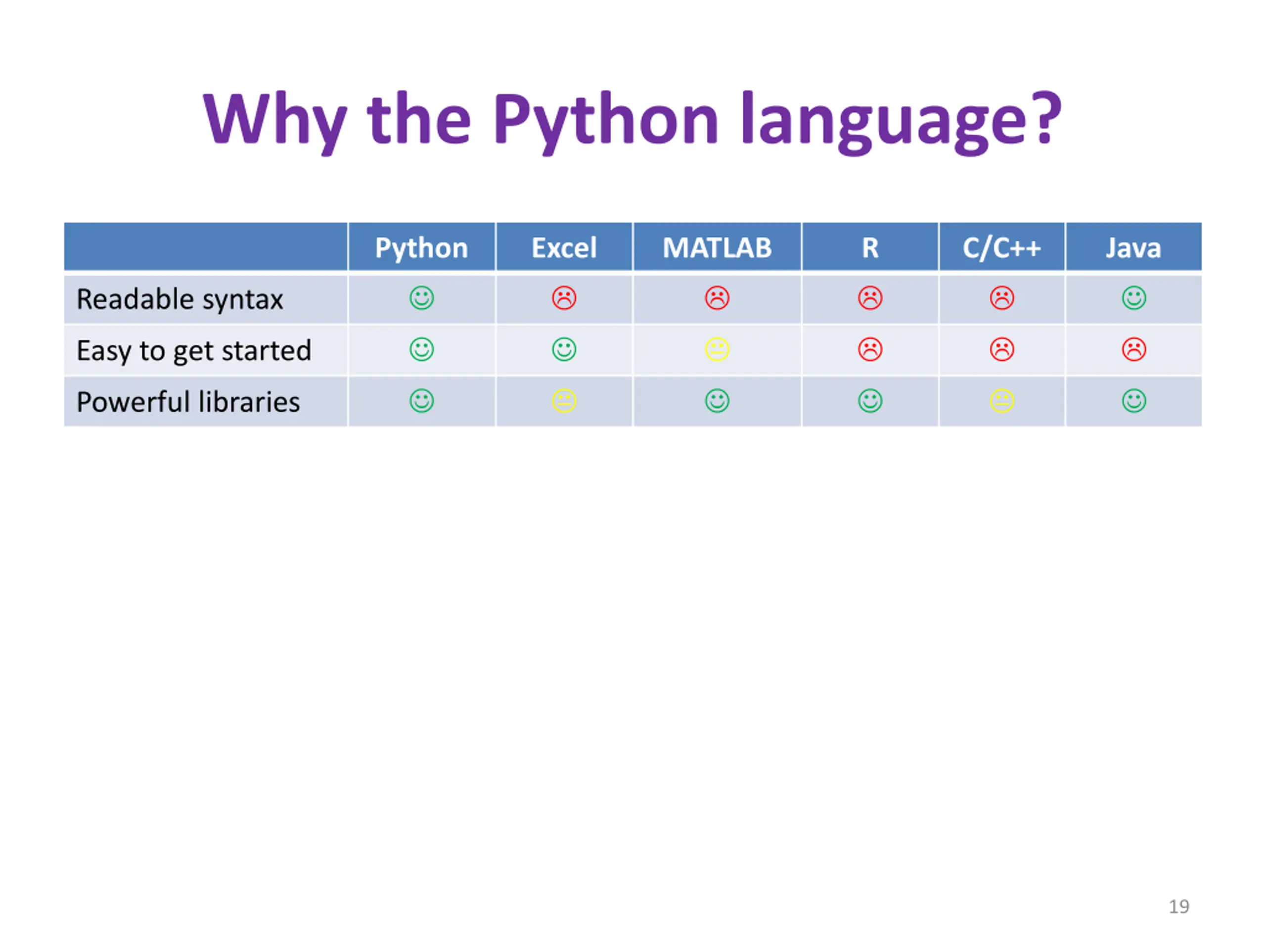 Why the Python language? Python Excel MATLAB R C/C++ Java Readable syntax Easy to get started Powerful libraries 19