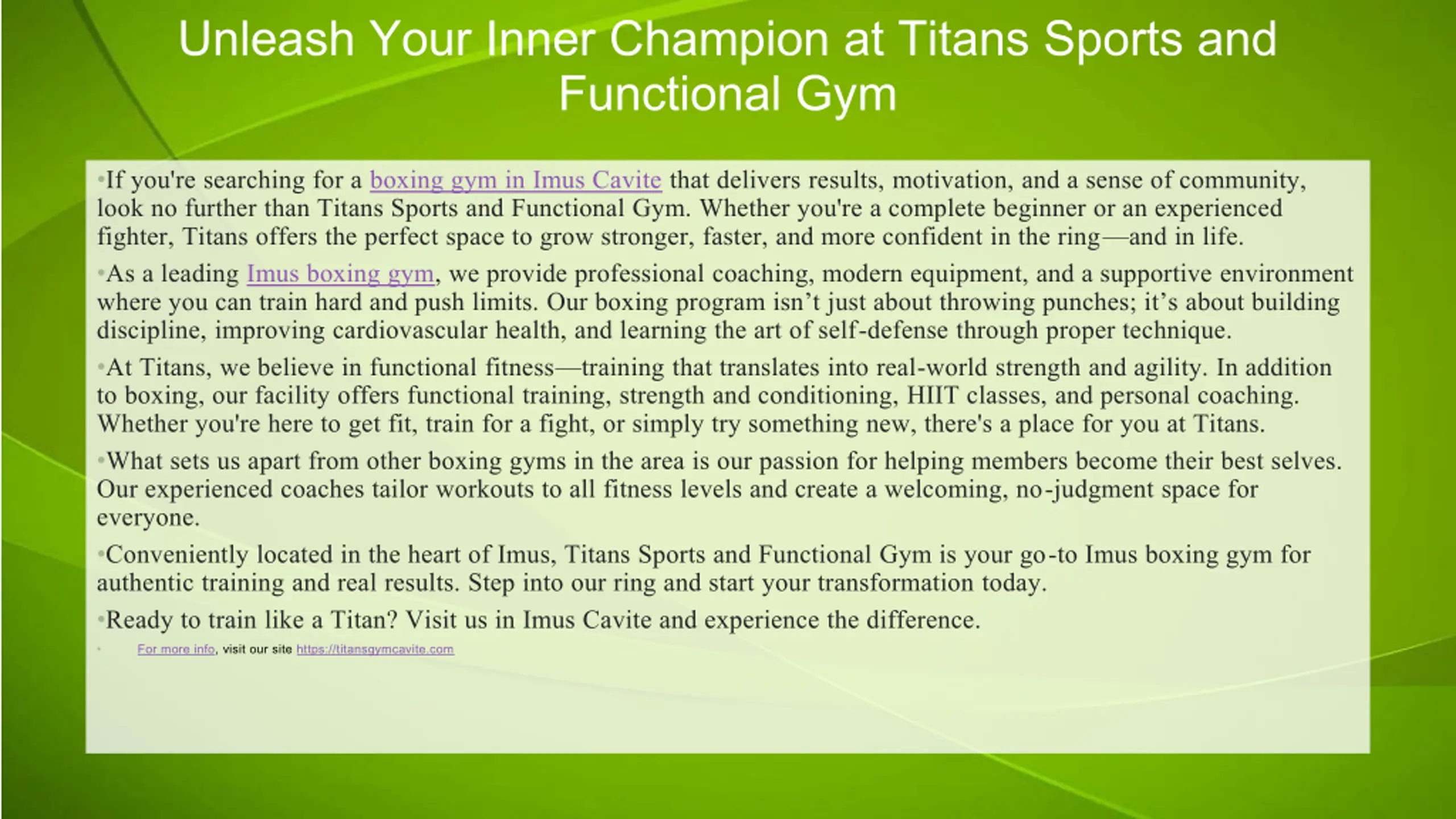 Unleash Your Inner Champion at Titans Sports and Functional Gym If you're searching for a boxing gym in Imus Cavite that delivers results, motivation, and a sense of community, look no further than Titans Sports and Functional Gym. Whether you're a complete beginner or an experienced fighter, Titans offers the perfect space to grow stronger, faster, and more confident in the ring and in life. As a leading Imus boxing gym, we provide professional coaching, modern equipment, and a supportive environment where you can train hard and push limits. Our boxing program isn t just about throwing punches; it s about building discipline, improving cardiovascular health, and learning the art of self-defense through proper technique. At Titans, we believe in functional fitness training that translates into real-world strength and agility. In addition to boxing, our facility offers functional training, strength and conditioning, HIIT classes, and personal coaching. Whether you're here to get fit, train for a fight, or simply try something new, there's a place for you at Titans. What sets us apart from other boxing gyms in the area is our passion for helping members become their best selves. Our experienced coaches tailor workouts to all fitness levels and create a welcoming, no-judgment space for everyone. Conveniently located in the heart of Imus, Titans Sports and Functional Gym is your go-to Imus boxing gym for authentic training and real results. Step into our ring and start your transformation today. Ready to train like a Titan? Visit us in Imus Cavite and experience the difference. For more info, visit our site https://titansgymcavite.com