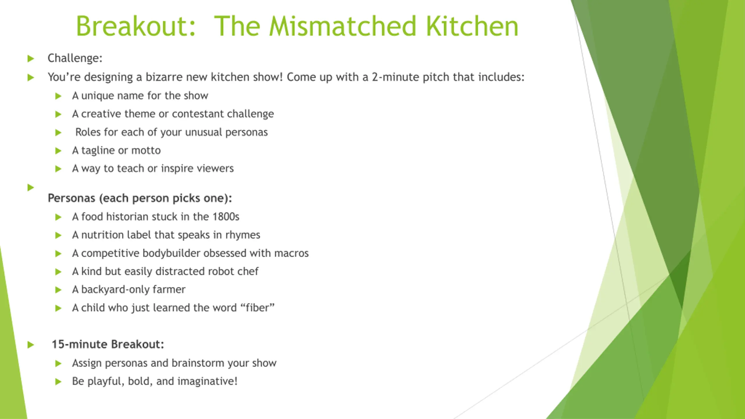 Breakout: The Mismatched Kitchen Challenge: You re designing a bizarre new kitchen show! Come up with a 2-minute pitch that includes: A unique name for the show A creative theme or contestant challenge Roles for each of your unusual personas A tagline or motto A way to teach or inspire viewers Personas (each person picks one): A food historian stuck in the 1800s A nutrition label that speaks in rhymes A competitive bodybuilder obsessed with macros A kind but easily distracted robot chef A backyard-only farmer A child who just learned the word fiber 15-minute Breakout: Assign personas and brainstorm your show Be playful, bold, and imaginative!