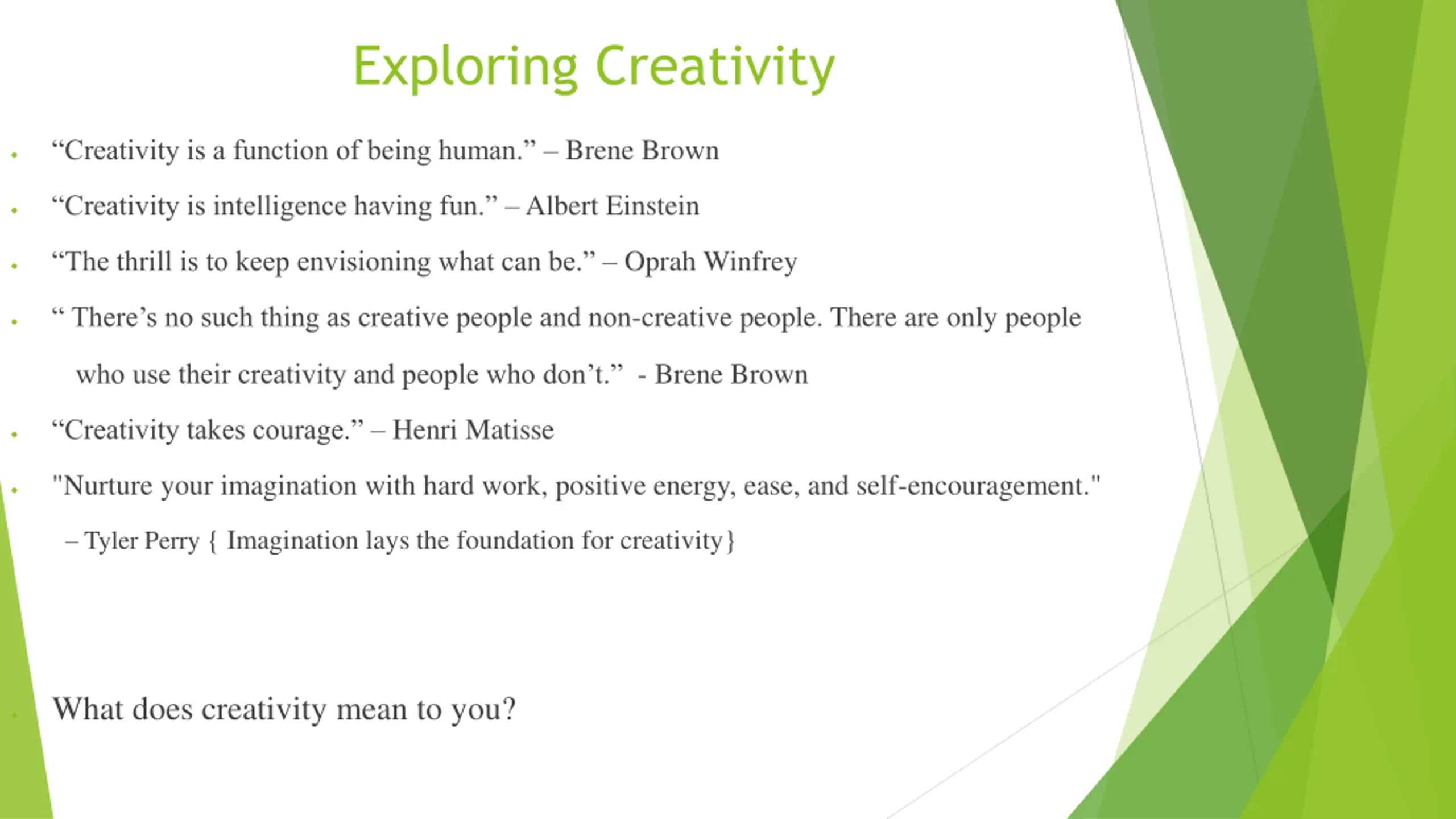 Exploring Creativity Creativity is a function of being human. Brene Brown Creativity is intelligence having fun. Albert Einstein The thrill is to keep envisioning what can be. Oprah Winfrey There s no such thing as creative people and non-creative people. There are only people who use their creativity and people who don t. - Brene Brown Creativity takes courage. Henri Matisse "Nurture your imagination with hard work, positive energy, ease, and self-encouragement." Tyler Perry { Imagination lays the foundation for creativity} What does creativity mean to you?