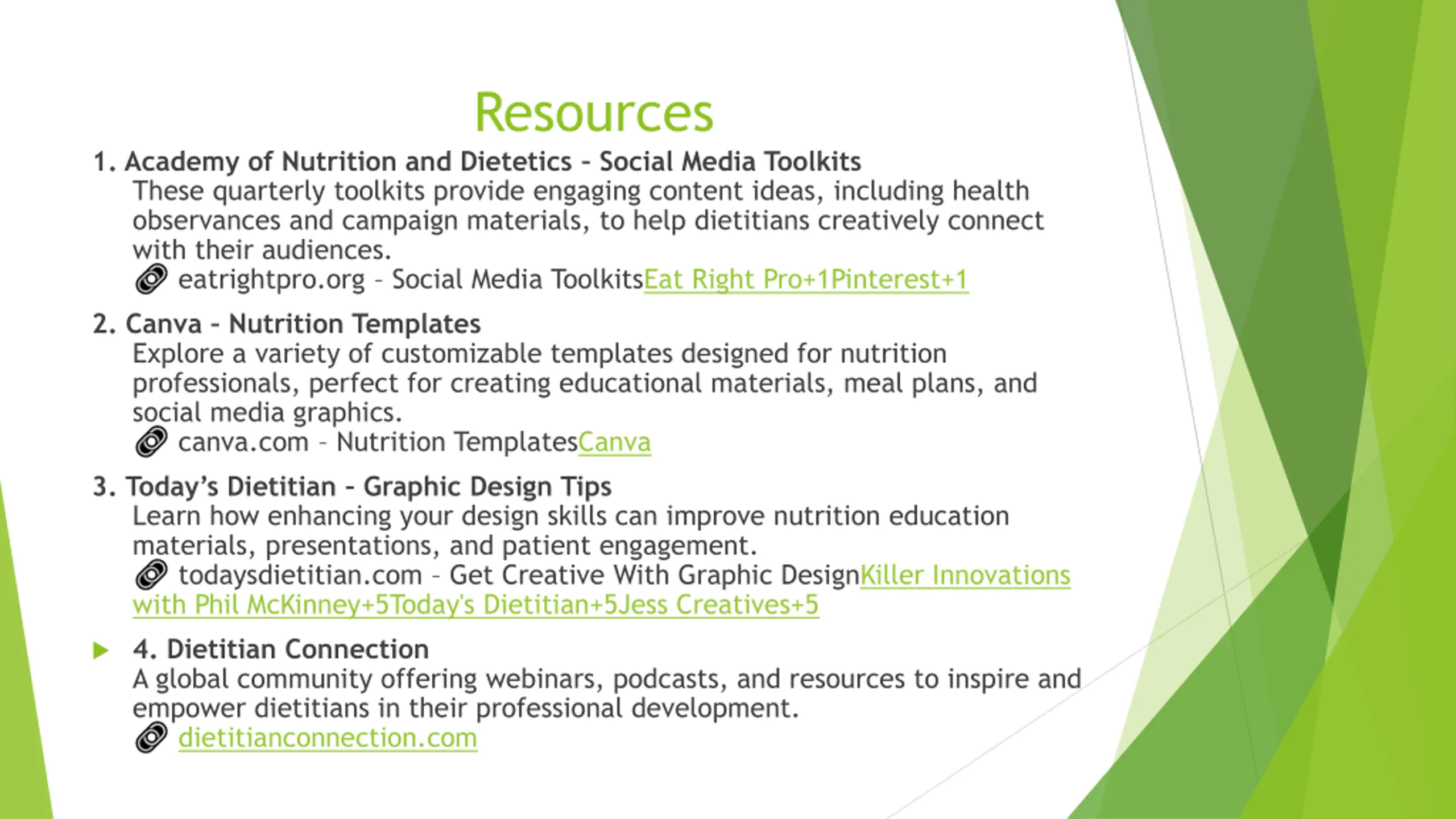 Resources 1. Academy of Nutrition and Dietetics Social Media Toolkits These quarterly toolkits provide engaging content ideas, including health observances and campaign materials, to help dietitians creatively connect with their audiences. eatrightpro.org Social Media ToolkitsEat Right Pro+1Pinterest+1 2. Canva Nutrition Templates Explore a variety of customizable templates designed for nutrition professionals, perfect for creating educational materials, meal plans, and social media graphics. canva.com Nutrition TemplatesCanva 3. Today s Dietitian Graphic Design Tips Learn how enhancing your design skills can improve nutrition education materials, presentations, and patient engagement. todaysdietitian.com Get Creative With Graphic DesignKiller Innovations with Phil McKinney+5Today's Dietitian+5Jess Creatives+5 4. Dietitian Connection A global community offering webinars, podcasts, and resources to inspire and empower dietitians in their professional development. dietitianconnection.com