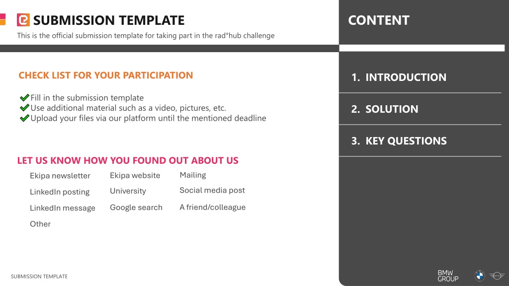 CONTENT SUBMISSION TEMPLATE This is the official submission template for taking part in the rad hub challenge CHECK LIST FOR YOUR PARTICIPATION 1. INTRODUCTION Fill in the submission template Use additional material such as a video, pictures, etc. Upload your files via our platform until the mentioned deadline 2. SOLUTION 3. KEY QUESTIONS LET US KNOW HOW YOU FOUND OUT ABOUT US Ekipa website Mailing Ekipa newsletter Social media post University LinkedIn posting A friend/colleague Google search LinkedIn message Other SUBMISSION TEMPLATE