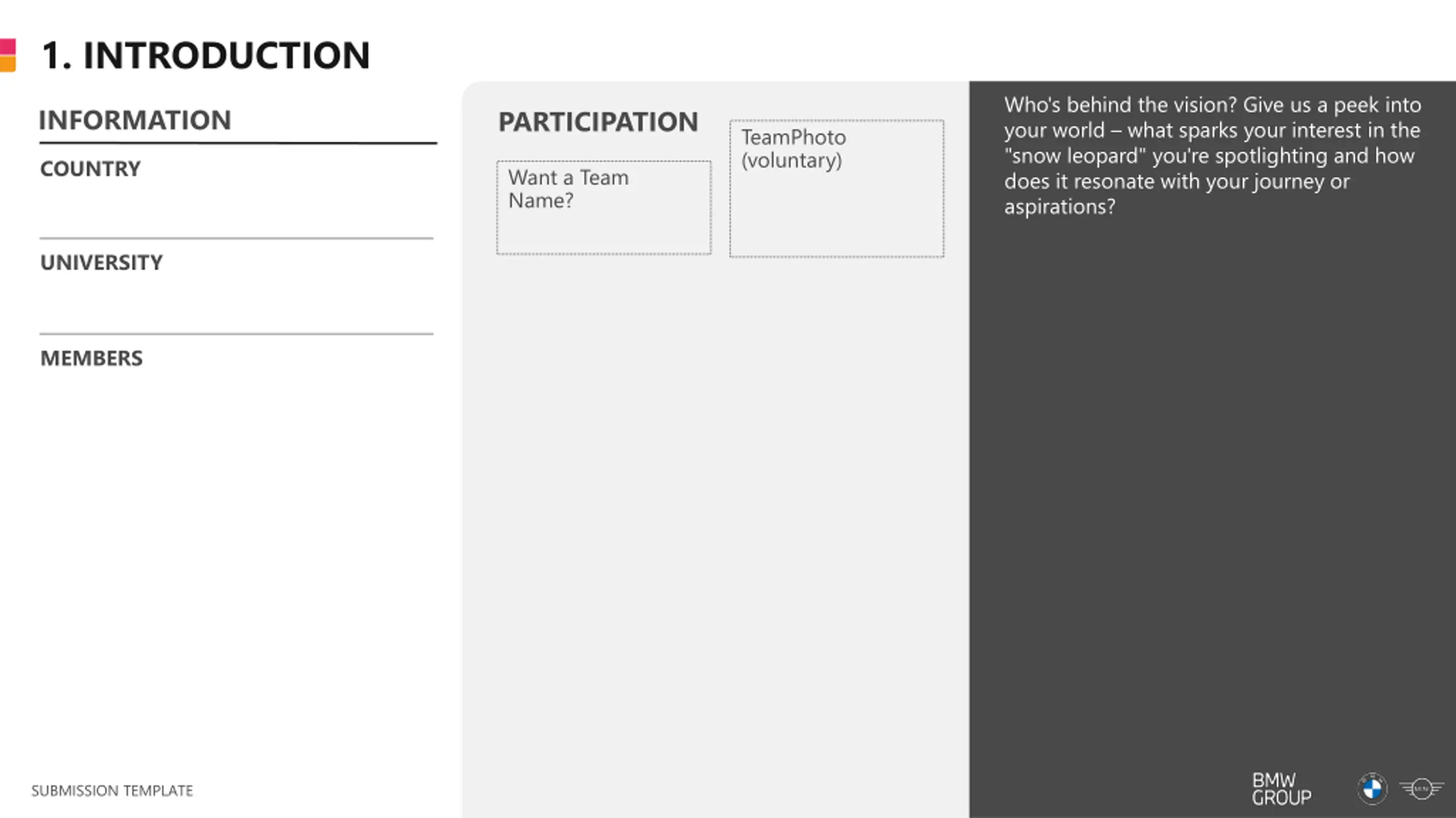 1. INTRODUCTION Who's behind the vision? Give us a peek into your world what sparks your interest in the "snow leopard" you're spotlighting and how does it resonate with your journey or aspirations? INFORMATION PARTICIPATION TeamPhoto (voluntary) COUNTRY Want a Team Name? UNIVERSITY MEMBERS SUBMISSION TEMPLATE