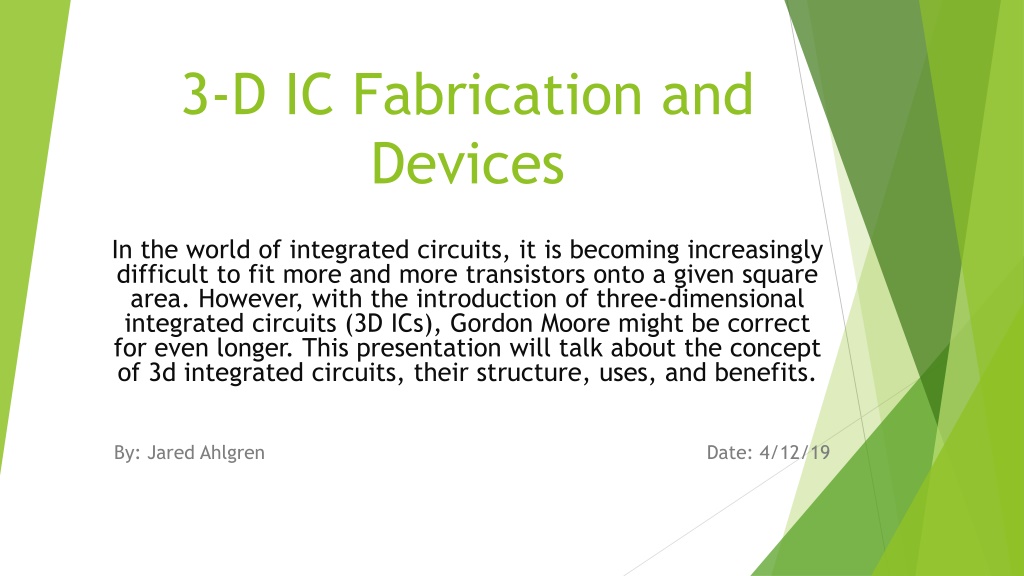 3-D IC Fabrication and Devices In the world of integrated circuits, it is becoming increasingly difficult to fit more and more transistors onto a given square area. However, with the introduction of three-dimensional integrated circuits (3D ICs), Gordon Moore might be correct for even longer. This presentation will talk about the concept of 3d integrated circuits, their structure, uses, and benefits. By: Jared Ahlgren Date: 4/12/19