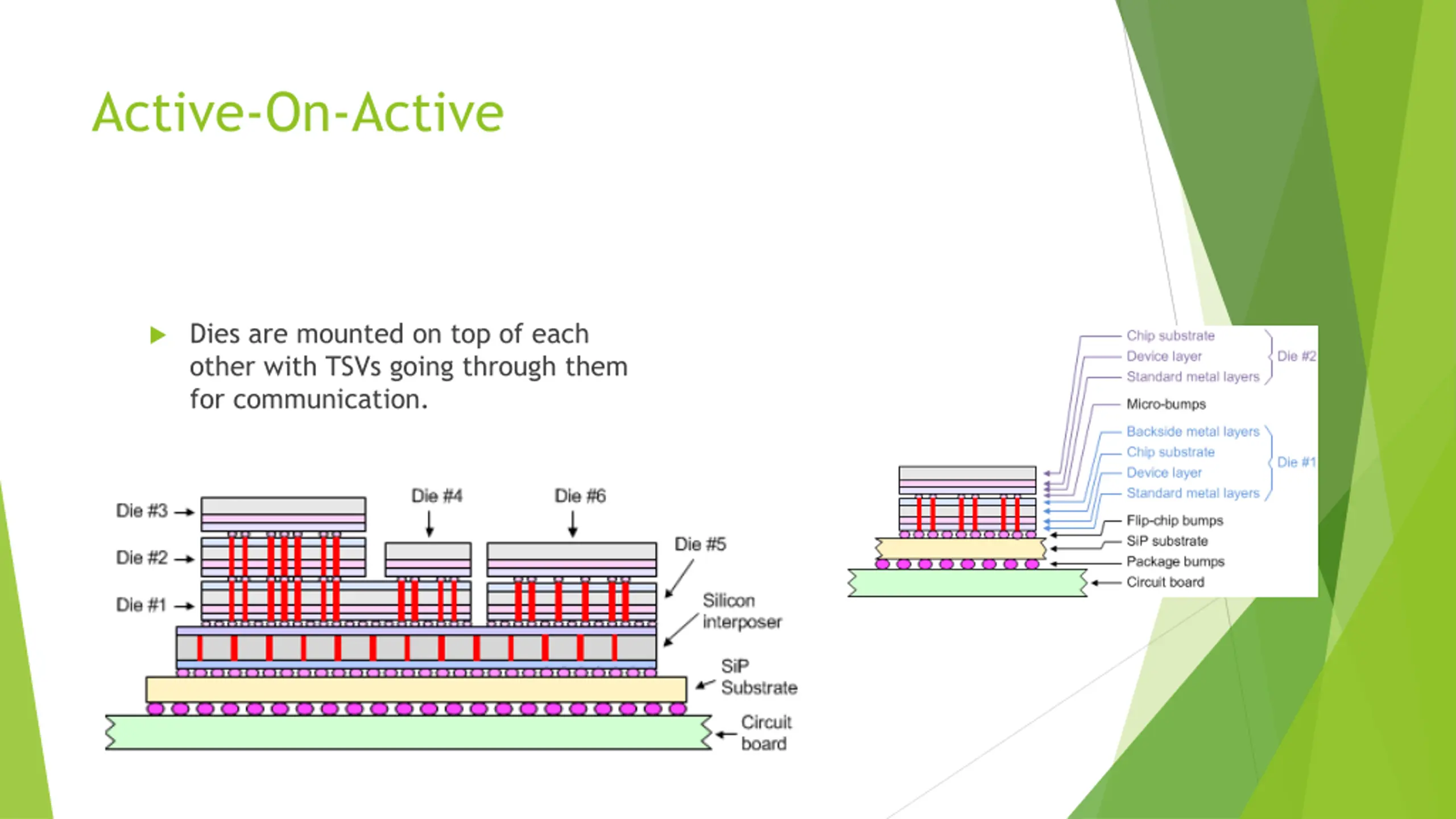 Active-On-Active Dies are mounted on top of each other with TSVs going through them for communication.