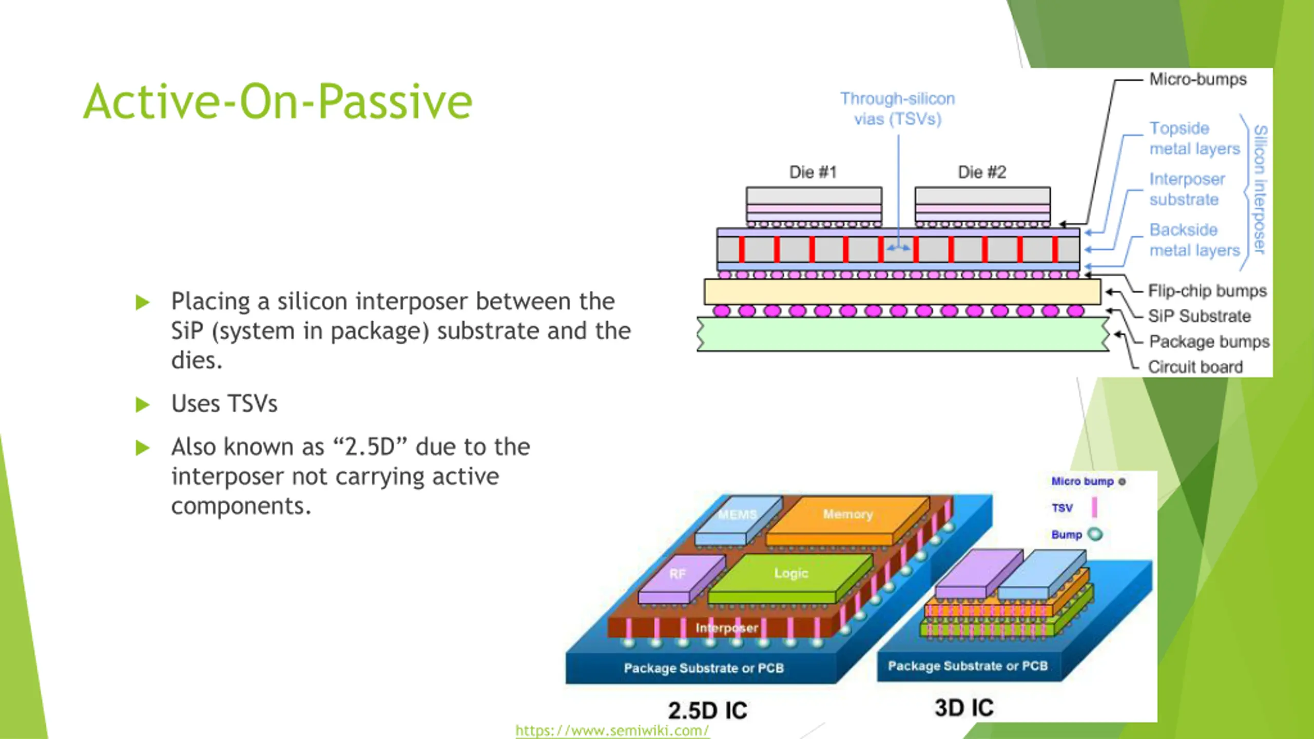 Active-On-Passive Placing a silicon interposer between the SiP (system in package) substrate and the dies. Uses TSVs Also known as 2.5D due to the interposer not carrying active components. https://www.semiwiki.com/