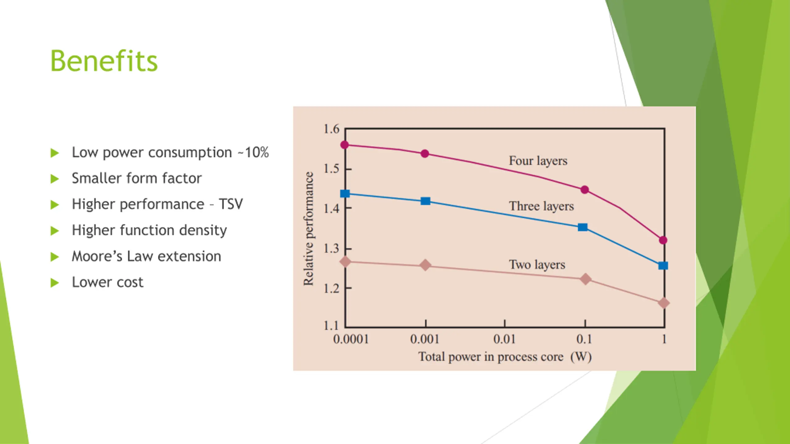Benefits Low power consumption ~10% Smaller form factor Higher performance TSV Higher function density Moore s Law extension Lower cost