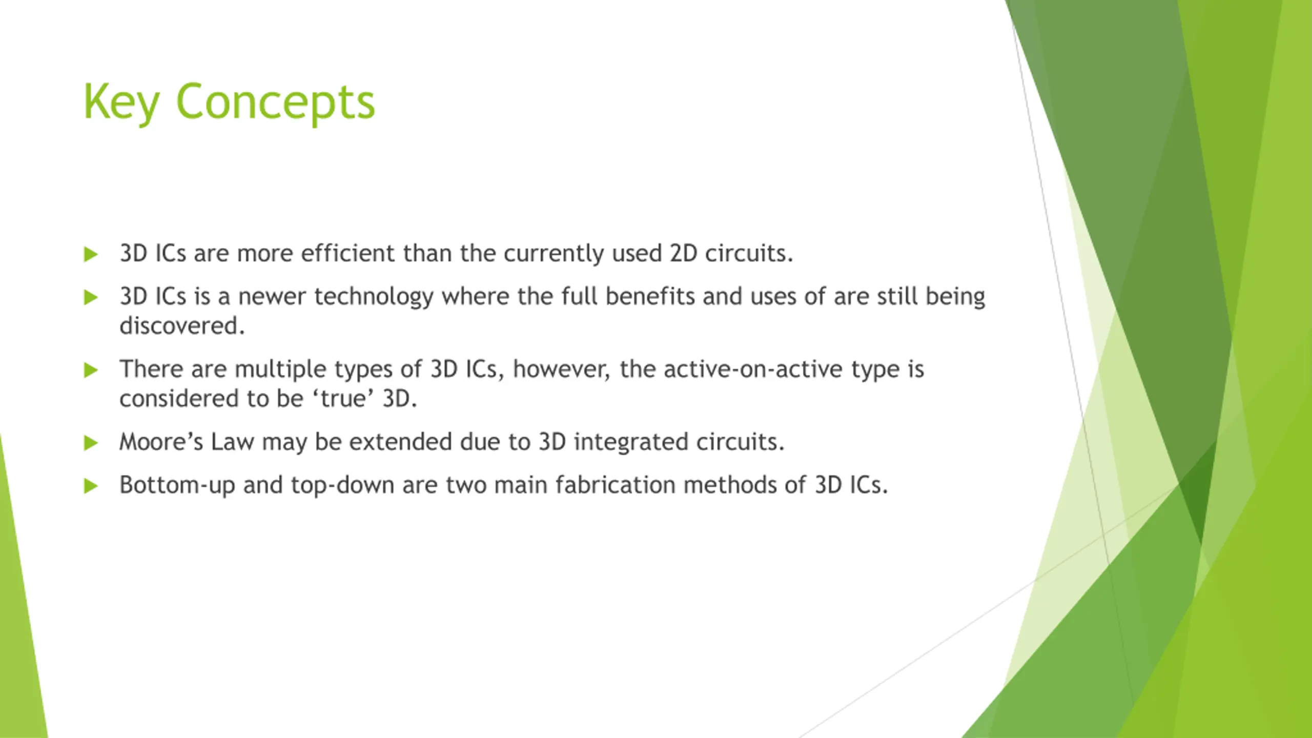 Key Concepts 3D ICs are more efficient than the currently used 2D circuits. 3D ICs is a newer technology where the full benefits and uses of are still being discovered. There are multiple types of 3D ICs, however, the active-on-active type is considered to be true 3D. Moore s Law may be extended due to 3D integrated circuits. Bottom-up and top-down are two main fabrication methods of 3D ICs.