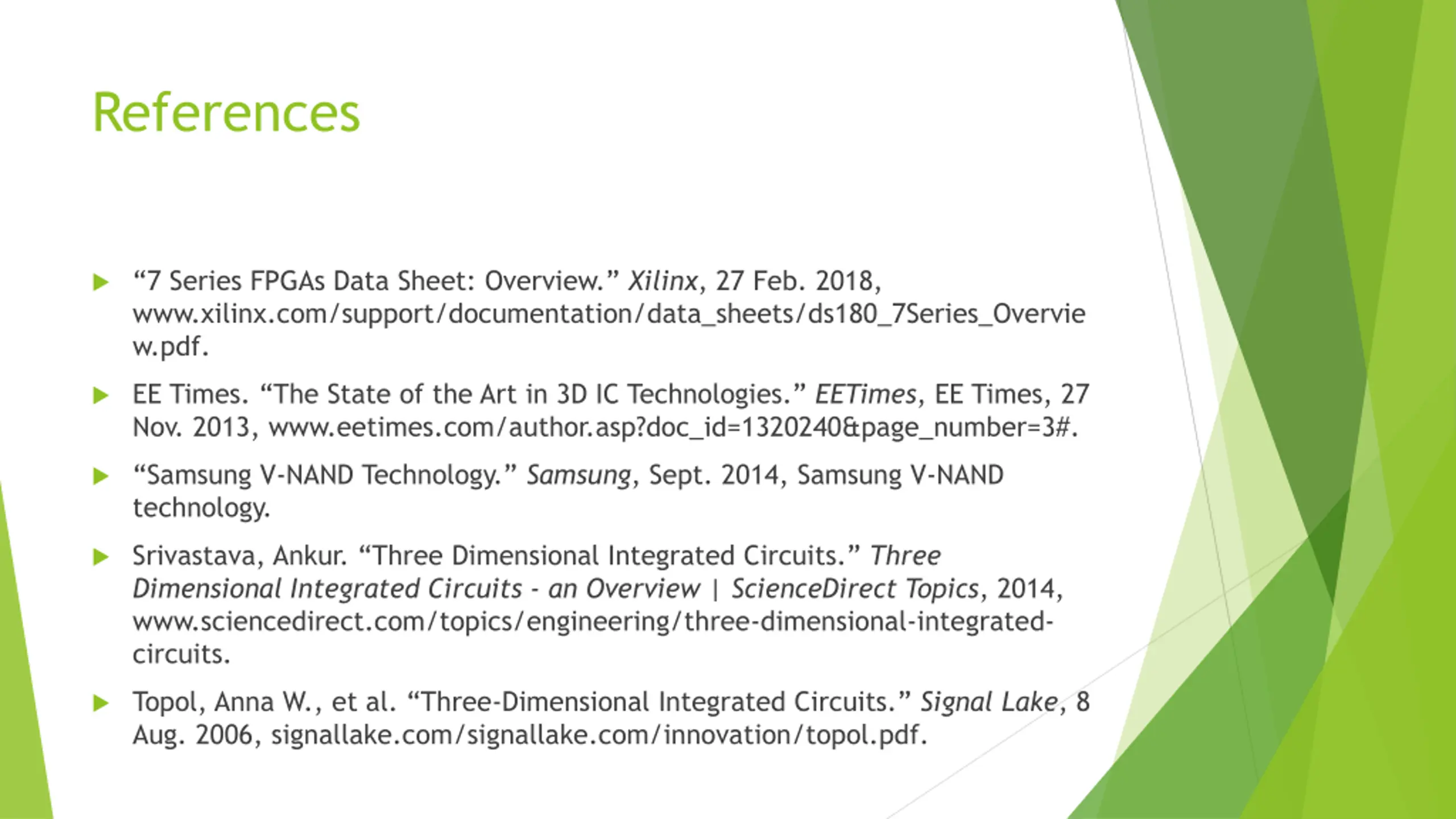 References 7 Series FPGAs Data Sheet: Overview. Xilinx, 27 Feb. 2018, www.xilinx.com/support/documentation/data_sheets/ds180_7Series_Overvie w.pdf. EE Times. The State of the Art in 3D IC Technologies. EETimes, EE Times, 27 Nov. 2013, www.eetimes.com/author.asp?doc_id=1320240&page_number=3#. Samsung V-NAND Technology. Samsung, Sept. 2014, Samsung V-NAND technology. Srivastava, Ankur. Three Dimensional Integrated Circuits. Three Dimensional Integrated Circuits - an Overview | ScienceDirect Topics, 2014, www.sciencedirect.com/topics/engineering/three-dimensional-integrated- circuits. Topol, Anna W., et al. Three-Dimensional Integrated Circuits. Signal Lake, 8 Aug. 2006, signallake.com/signallake.com/innovation/topol.pdf.