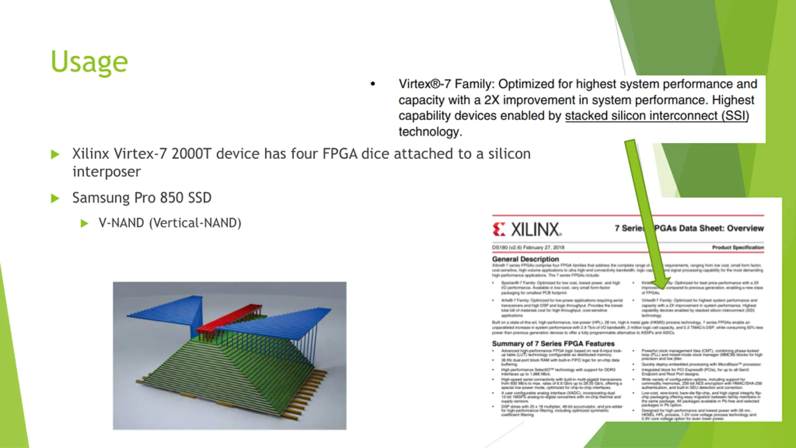 Usage Xilinx Virtex-7 2000T device has four FPGA dice attached to a silicon interposer Samsung Pro 850 SSD V-NAND (Vertical-NAND)