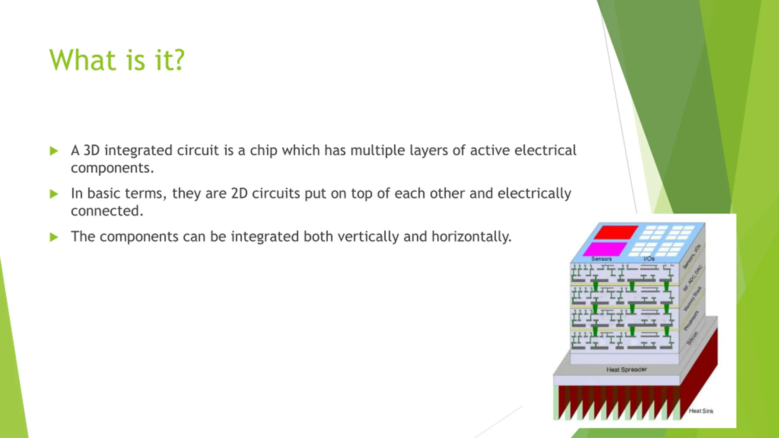 What is it? A 3D integrated circuit is a chip which has multiple layers of active electrical components. In basic terms, they are 2D circuits put on top of each other and electrically connected. The components can be integrated both vertically and horizontally.