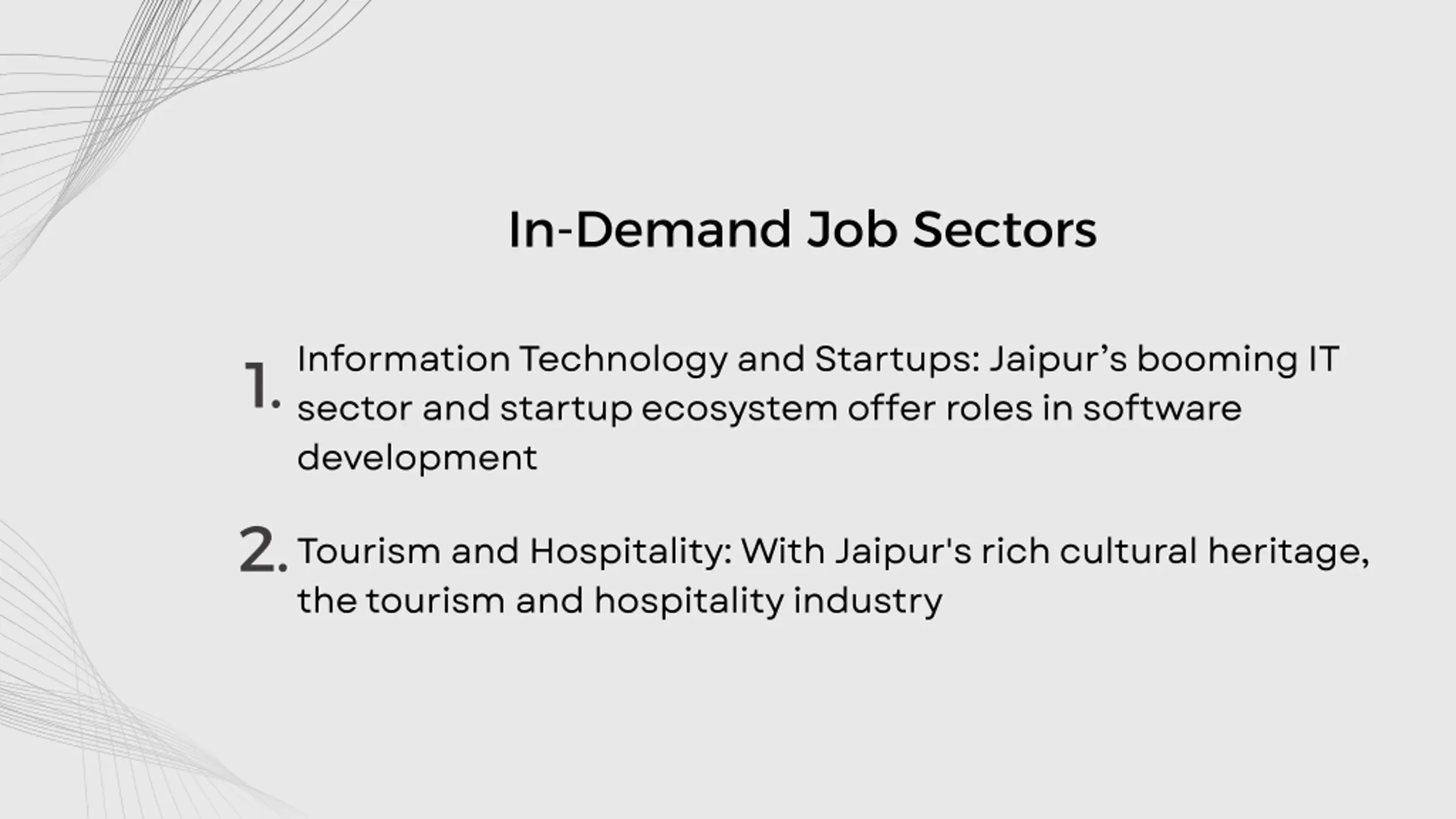 In-DemandJobSectors Information Technology and Startups: Jaipur s booming IT sector and startup ecosystem offer roles in software development 1. 2. Tourism and Hospitality: With Jaipur's rich cultural heritage, the tourism and hospitality industry