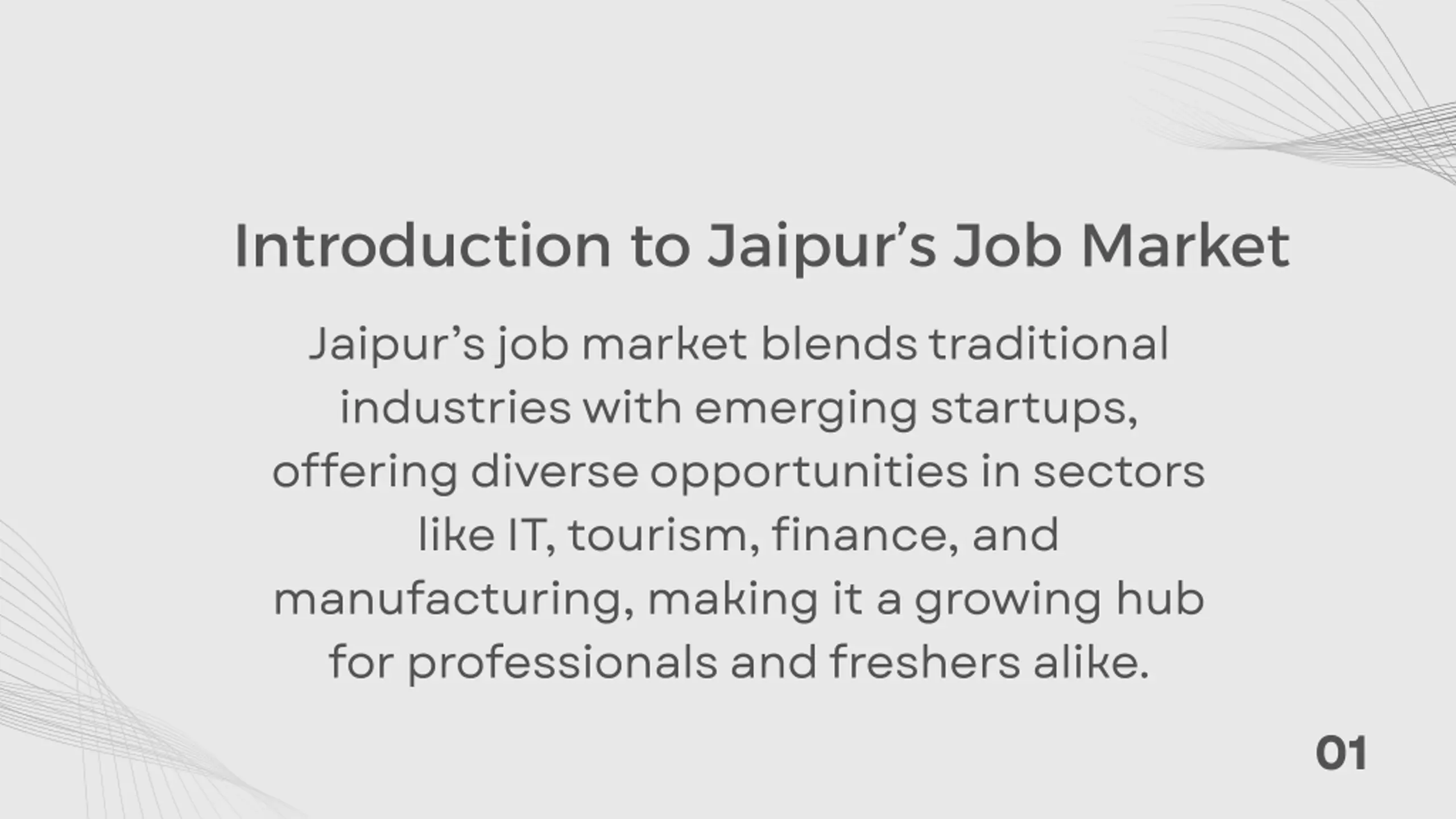 IntroductiontoJaipursJobMarket Jaipur s job market blends traditional industries with emerging startups, offering diverse opportunities in sectors like IT, tourism, finance, and manufacturing, making it a growing hub for professionals and freshers alike. 01