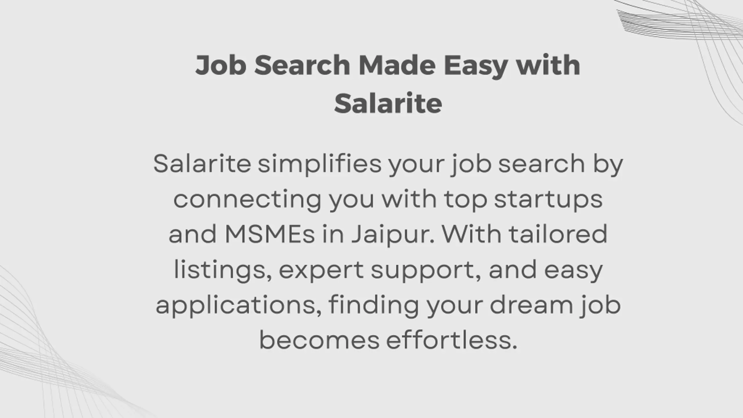 JobSearchMadeEasywith Salarite Salarite simplifies your job search by connecting you with top startups and MSMEs in Jaipur. With tailored listings, expert support, and easy applications, finding your dream job becomes effortless.