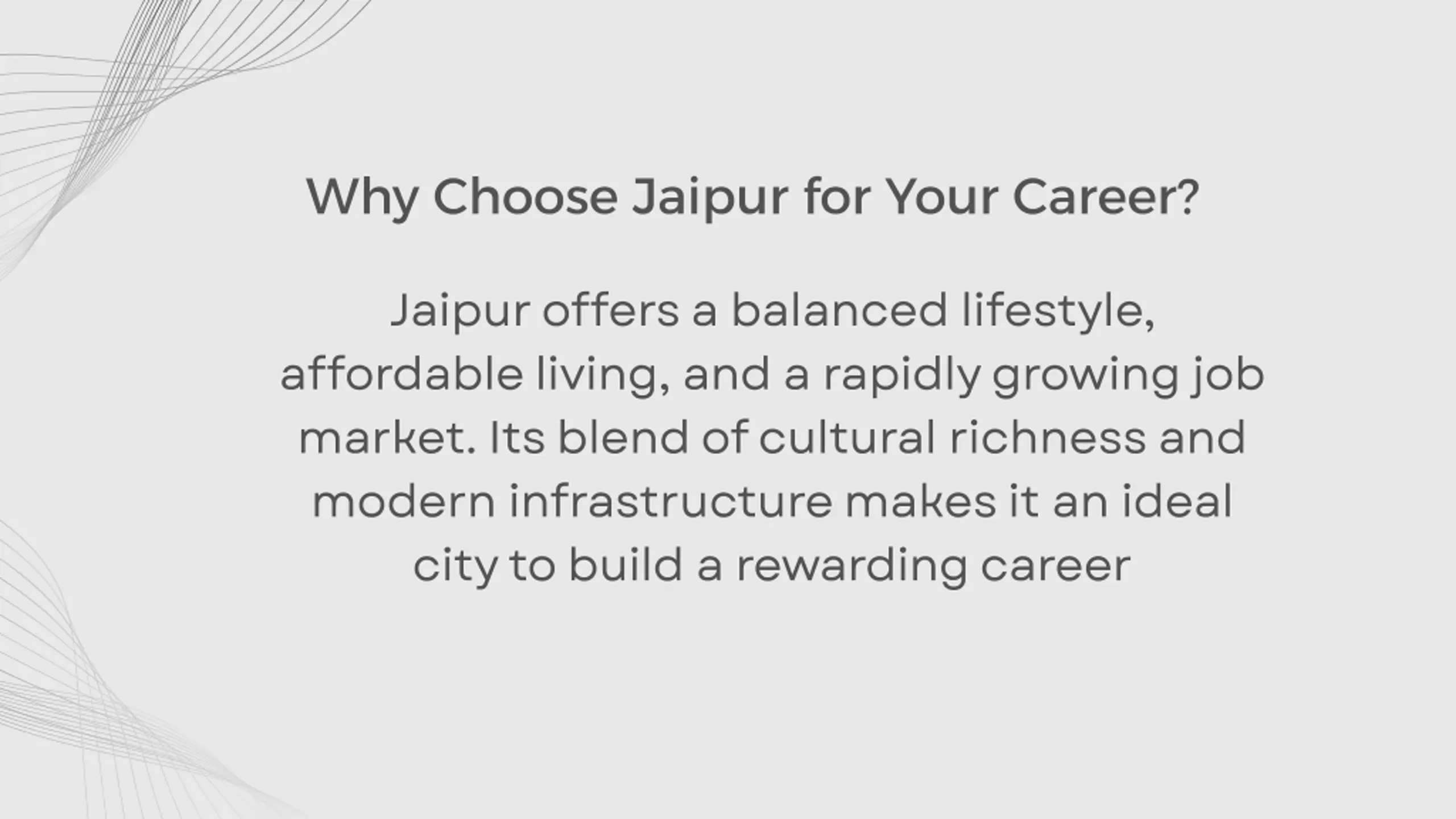 WhyChooseJaipurforYourCareer? Jaipur offers a balanced lifestyle, affordable living, and a rapidly growing job market. Its blend of cultural richness and modern infrastructure makes it an ideal city to build a rewarding career