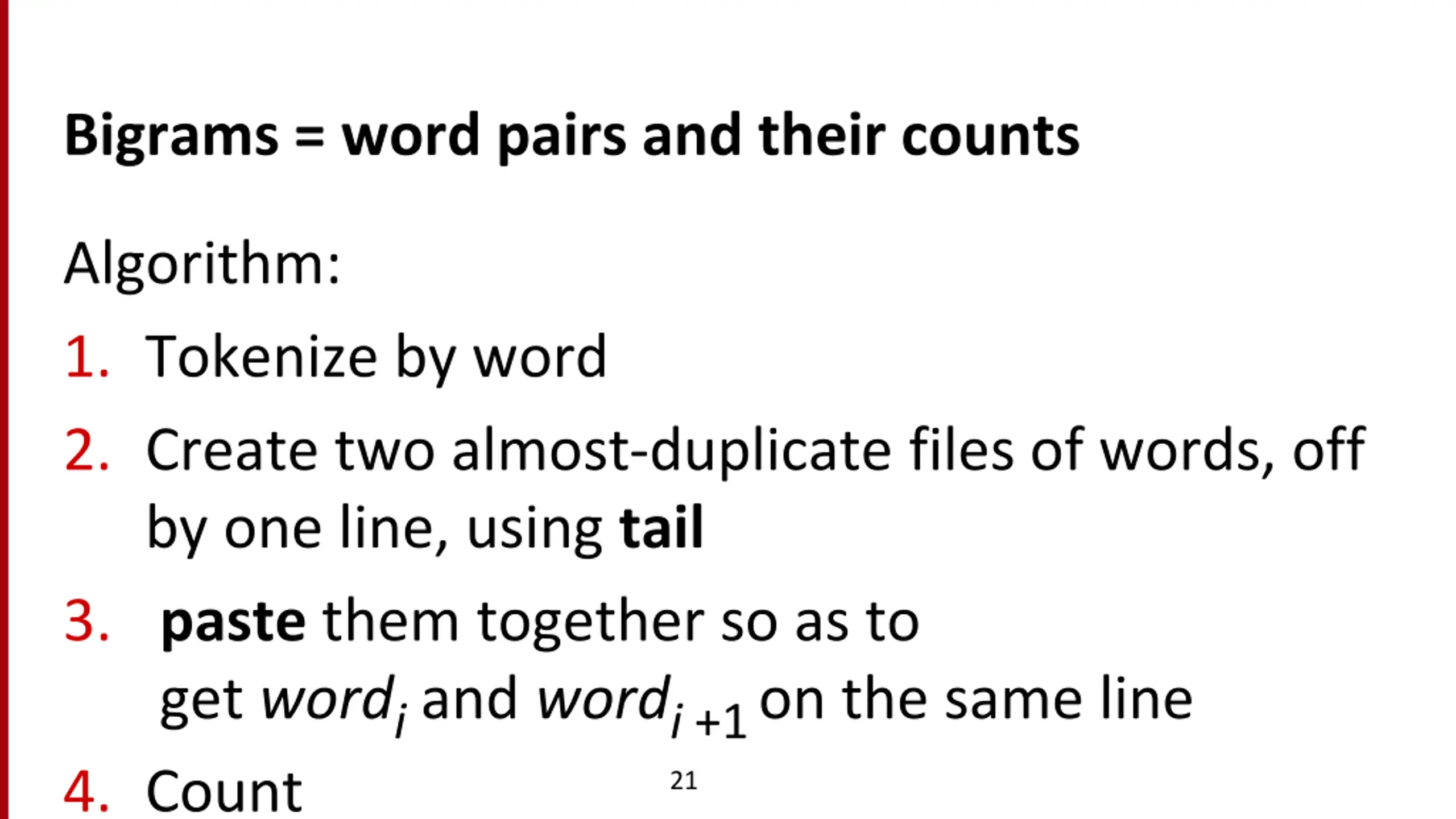 Bigrams = word pairs and their counts Algorithm: 1. Tokenize by word 2. Create two almost-duplicate files of words, off by one line, using tail 3. paste them together so as to get wordiand wordi +1on the same line 4. Count 21