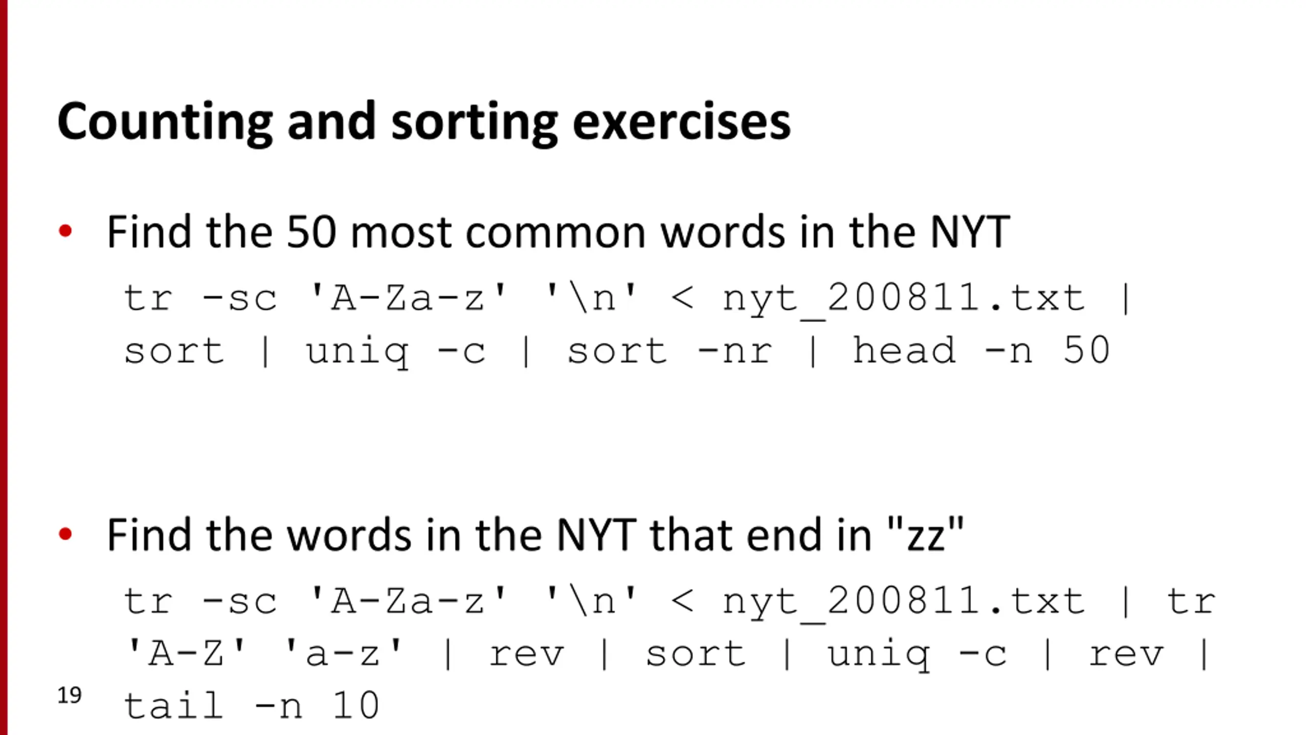 Counting and sorting exercises Find the 50 most common words in the NYT tr -sc 'A-Za-z' '\n' < nyt_200811.txt | sort | uniq -c | sort -nr | head -n 50 Find the words in the NYT that end in "zz" tr -sc 'A-Za-z' '\n' < nyt_200811.txt | tr 'A-Z' 'a-z' | rev | sort | uniq -c | rev | tail -n 10 19