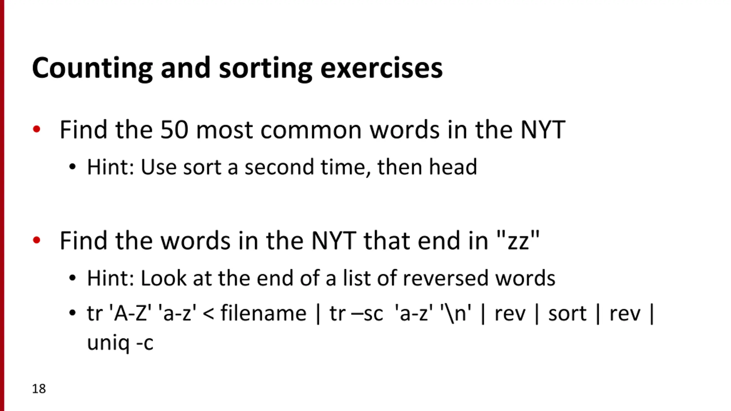 Counting and sorting exercises Find the 50 most common words in the NYT Hint: Use sort a second time, then head Find the words in the NYT that end in "zz" Hint: Look at the end of a list of reversed words tr 'A-Z' 'a-z' < filename | tr sc 'a-z' '\n' | rev | sort | rev | uniq -c 18