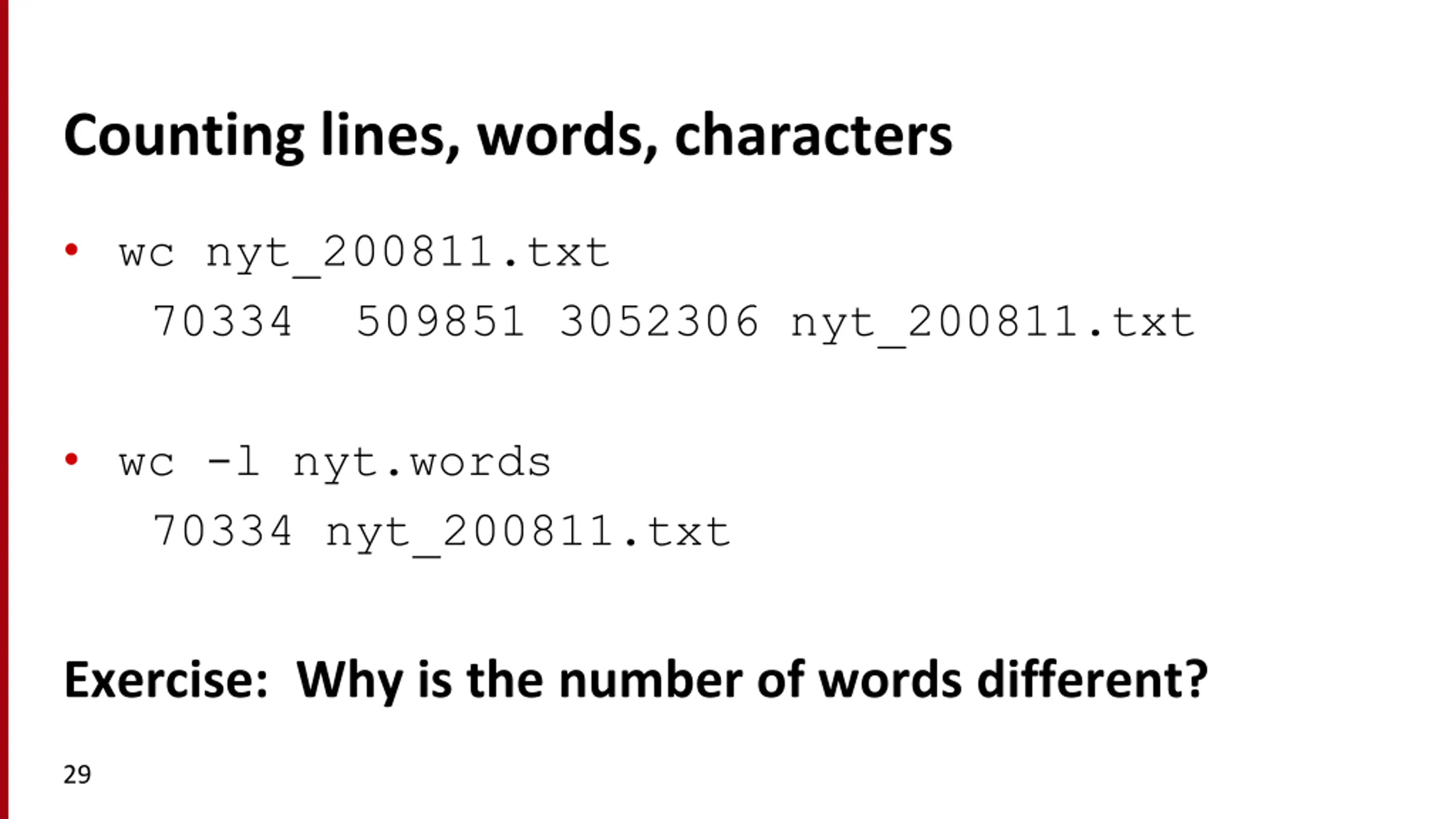 Counting lines, words, characters wc nyt_200811.txt 70334 509851 3052306 nyt_200811.txt wc -l nyt.words 70334 nyt_200811.txt Exercise: Why is the number of words different? 29