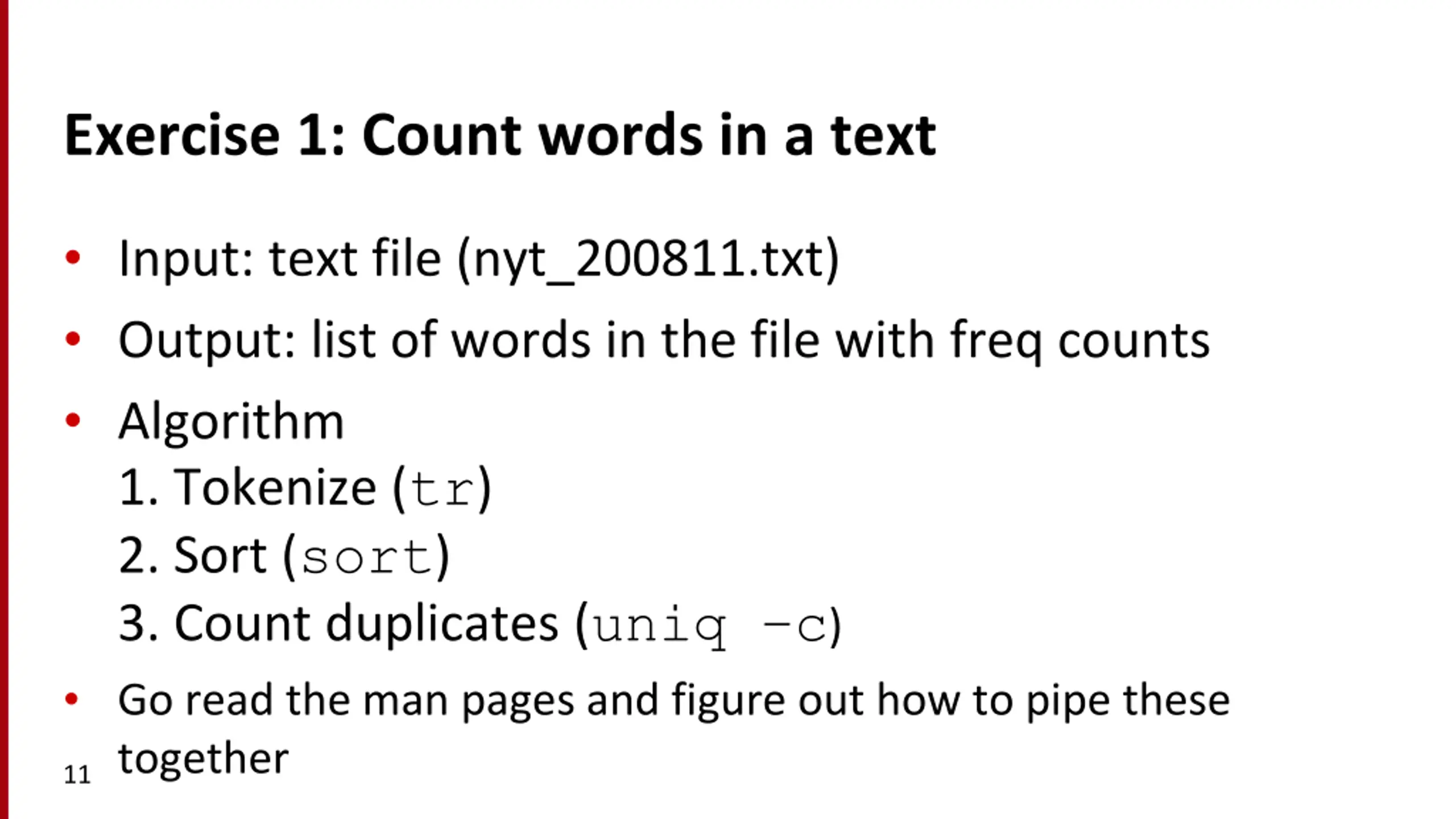 Exercise 1: Count words in a text Input: text file (nyt_200811.txt) Output: list of words in the file with freq counts Algorithm 1. Tokenize (tr) 2. Sort (sort) 3. Count duplicates (uniq c) Go read the man pages and figure out how to pipe these together 11