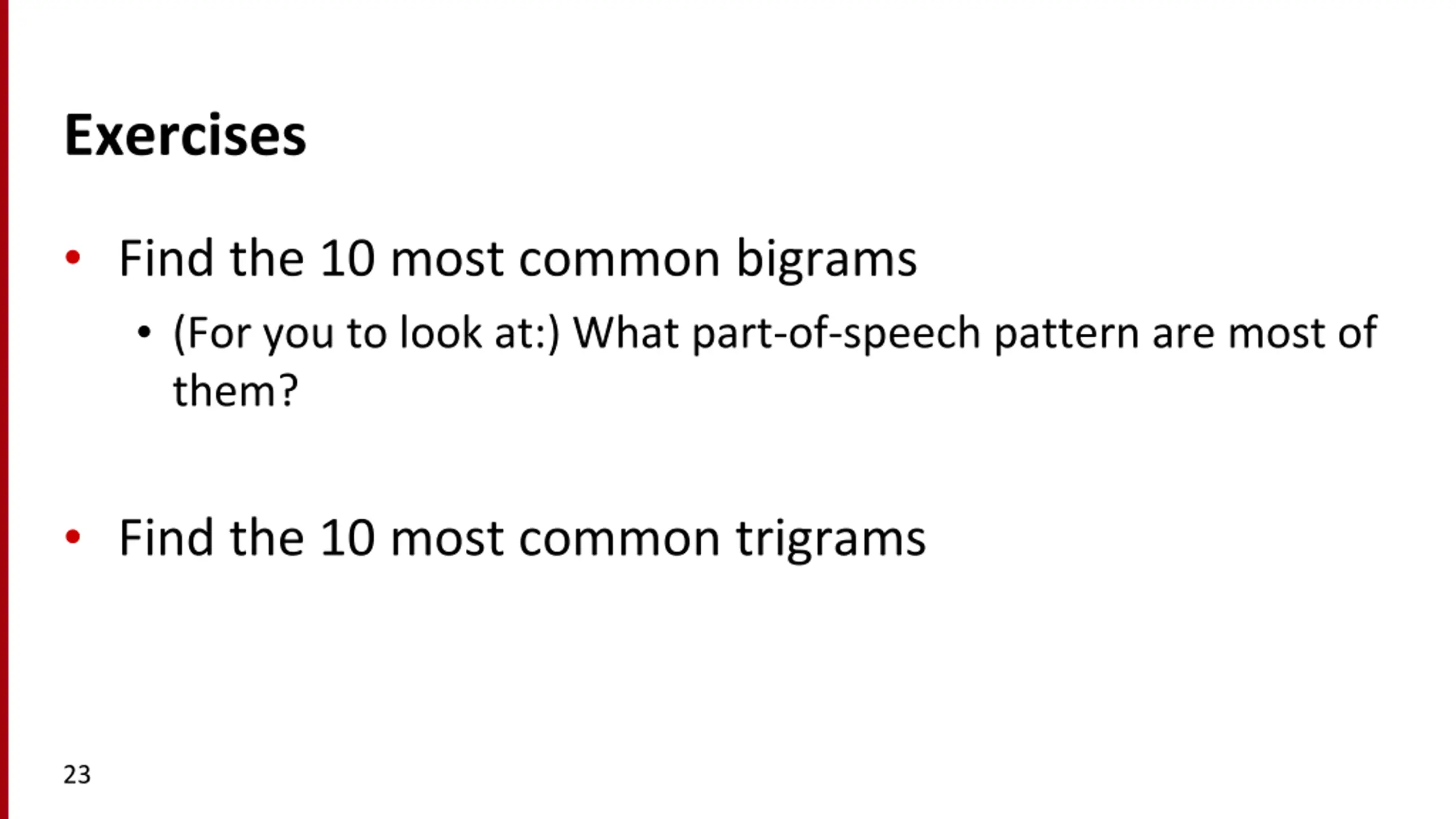 Exercises Find the 10 most common bigrams (For you to look at:) What part-of-speech pattern are most of them? Find the 10 most common trigrams 23