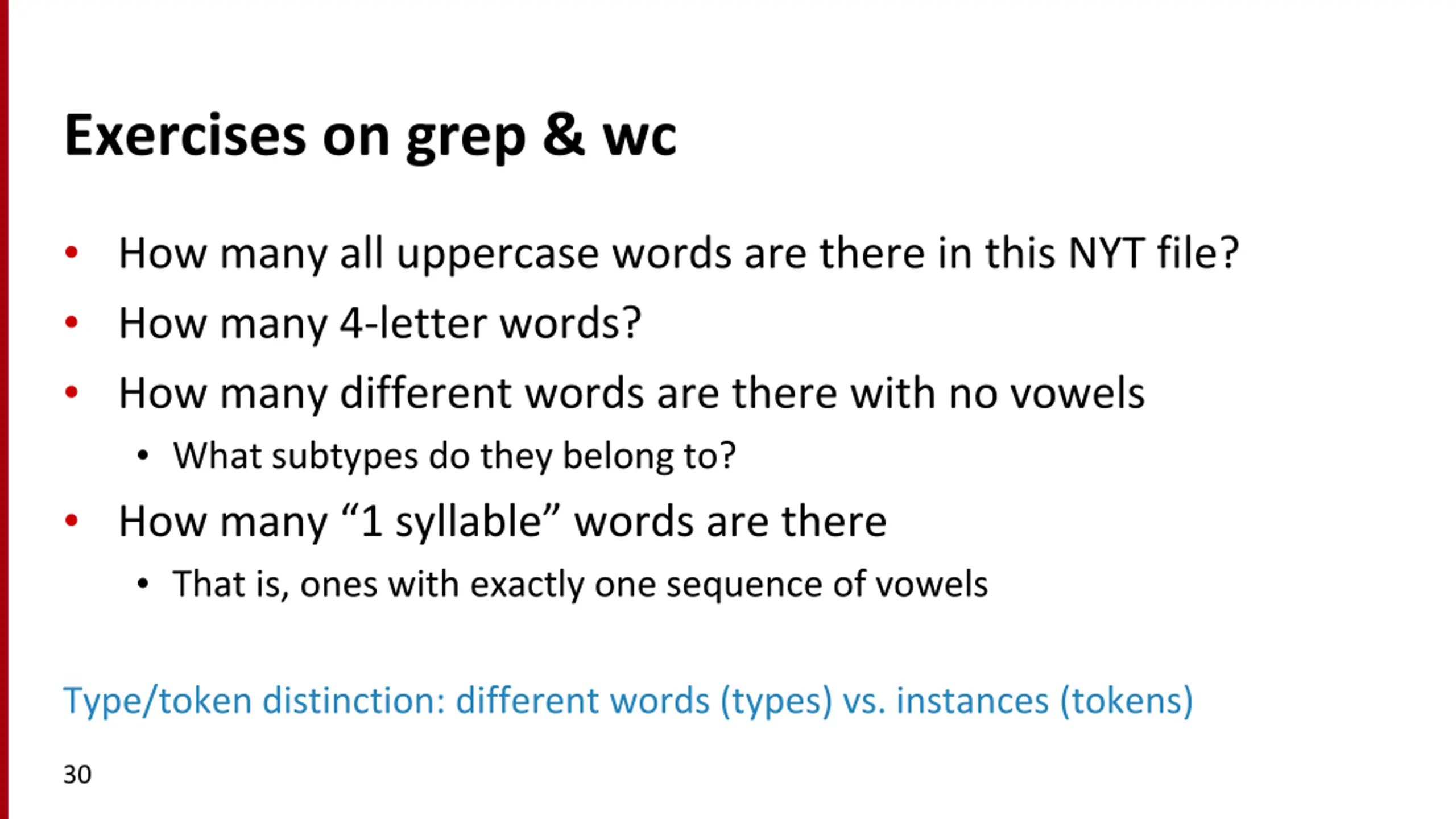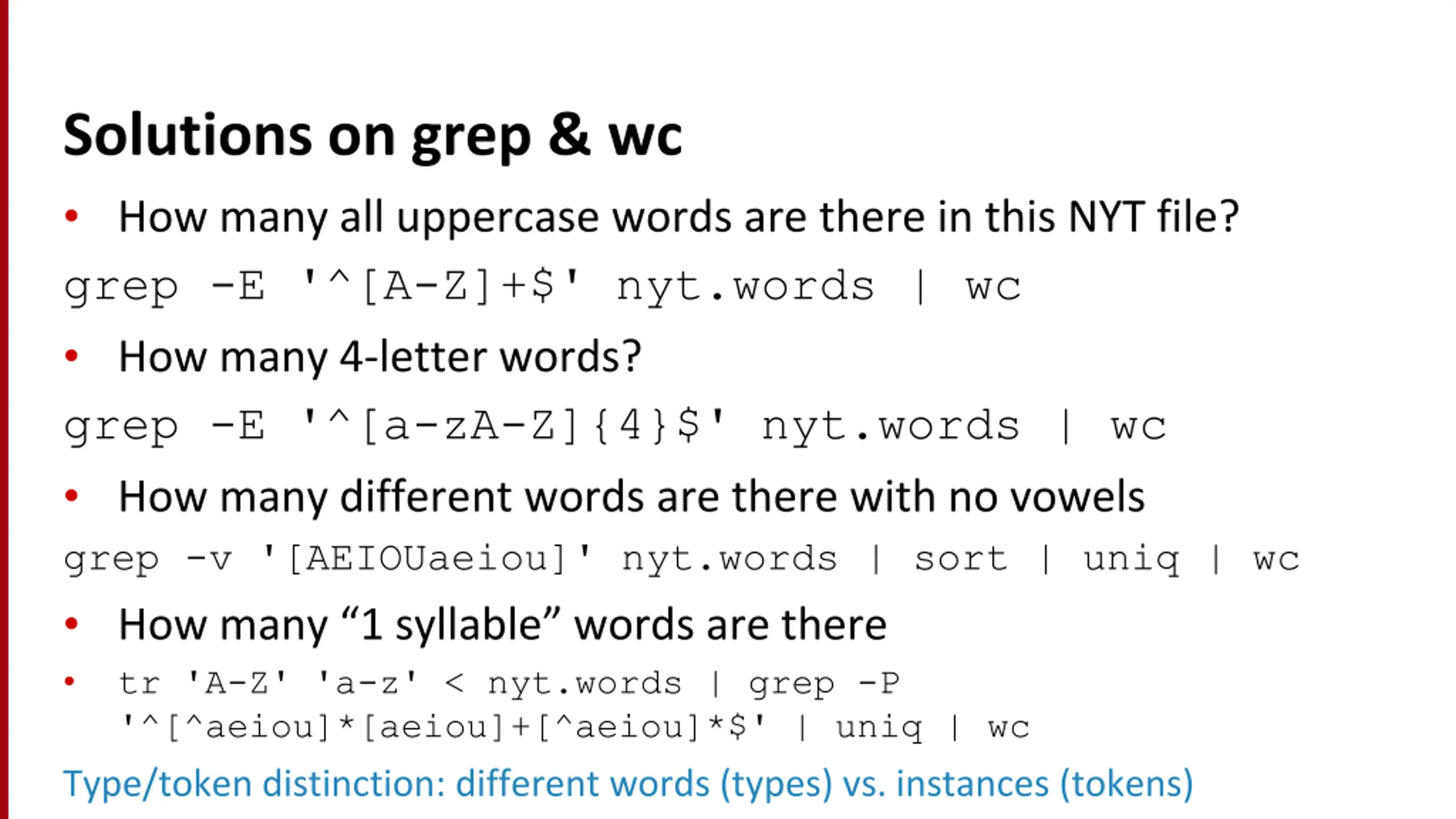 Solutions on grep & wc How many all uppercase words are there in this NYT file? grep -E '^[A-Z]+$' nyt.words | wc How many 4-letter words? grep -E '^[a-zA-Z]{4}$' nyt.words | wc How many different words are there with no vowels grep -v '[AEIOUaeiou]' nyt.words | sort | uniq | wc How many 1 syllable words are there tr 'A-Z' 'a-z' < nyt.words | grep -P '^[^aeiou]*[aeiou]+[^aeiou]*$' | uniq | wc Type/token distinction: different words (types) vs. instances (tokens)