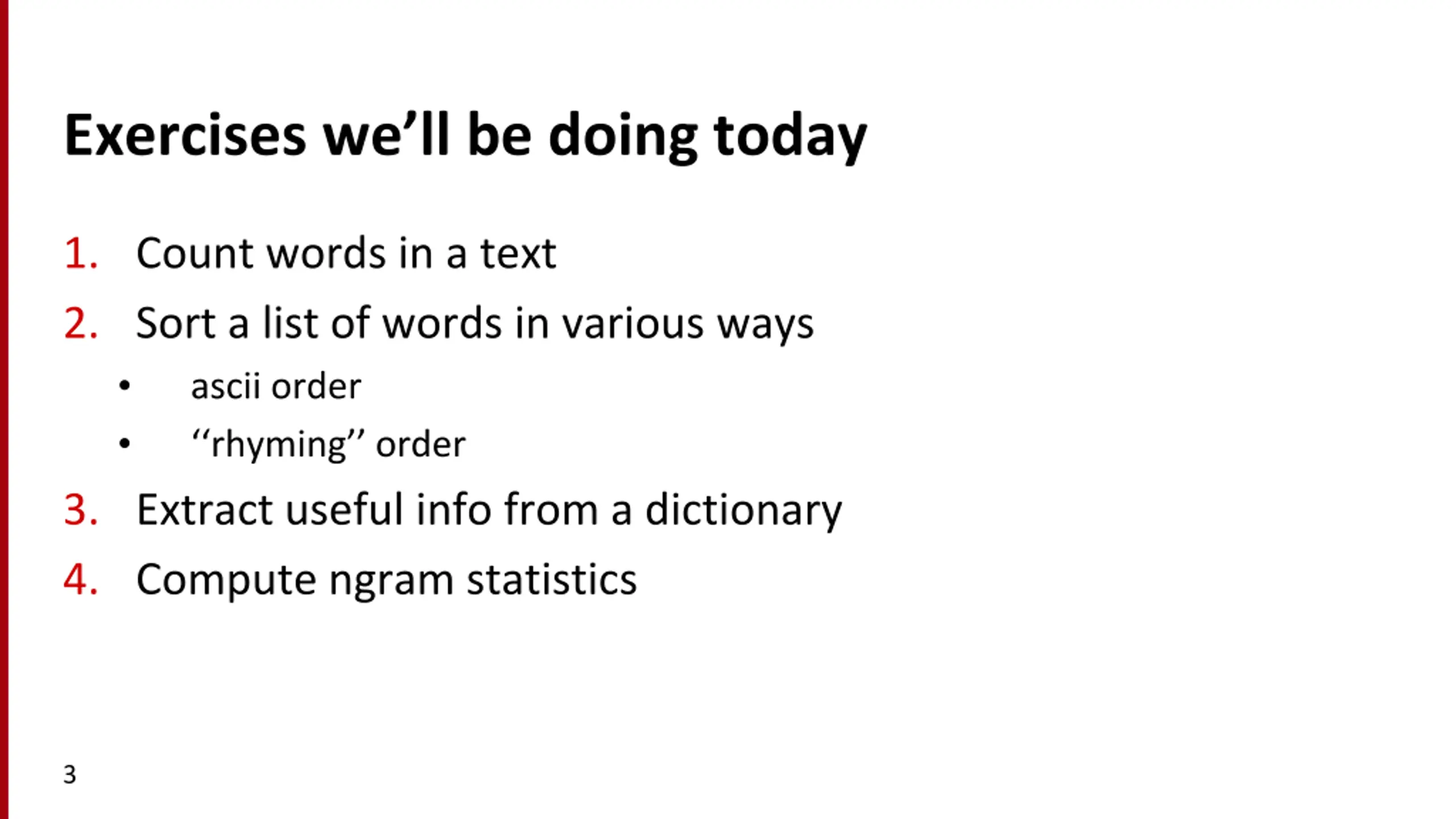 Exercises well be doing today 1. Count words in a text 2. Sort a list of words in various ways ascii order rhyming order 3. Extract useful info from a dictionary 4. Compute ngram statistics 3