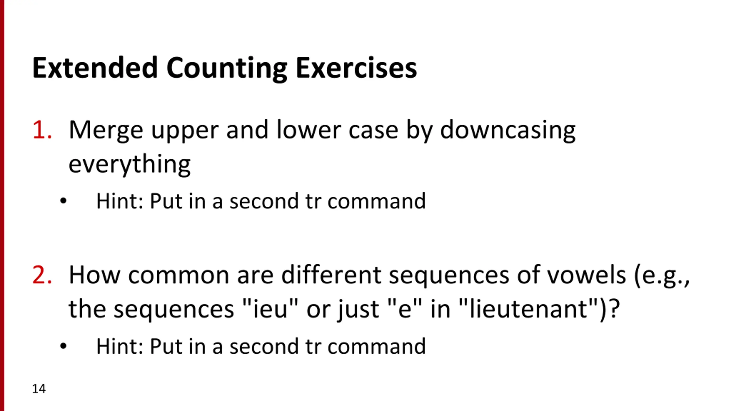 Extended Counting Exercises 1. Merge upper and lower case by downcasing everything Hint: Put in a second tr command 2. How common are different sequences of vowels (e.g., the sequences "ieu" or just "e" in "lieutenant")? Hint: Put in a second tr command 14