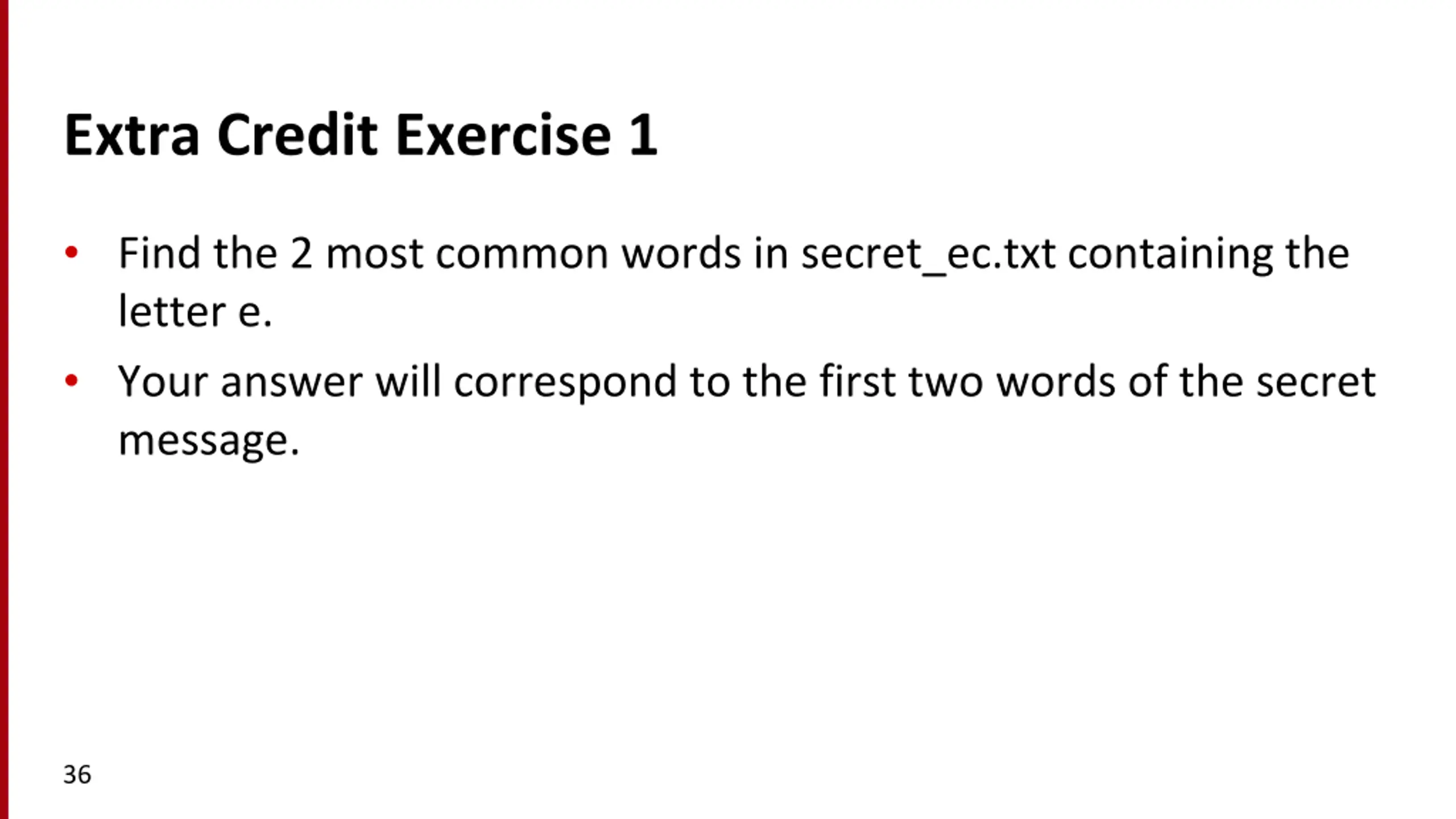 Extra Credit Exercise 1 Find the 2 most common words in secret_ec.txt containing the letter e. Your answer will correspond to the first two words of the secret message. 36
