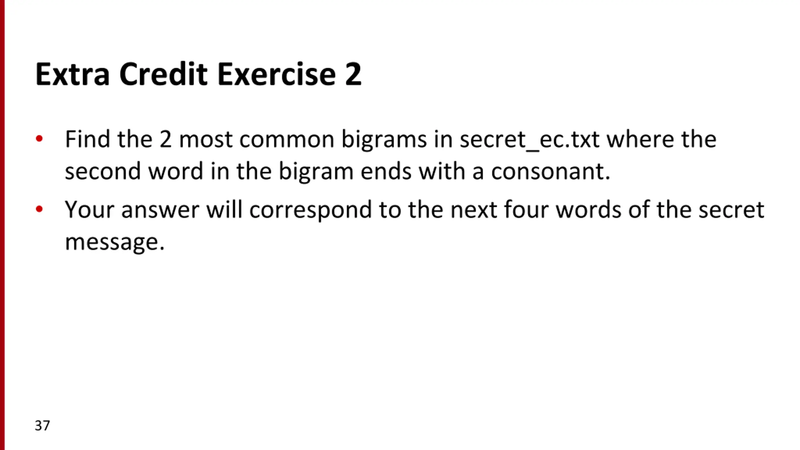 Extra Credit Exercise 2 Find the 2 most common bigrams in secret_ec.txt where the second word in the bigram ends with a consonant. Your answer will correspond to the next four words of the secret message. 37