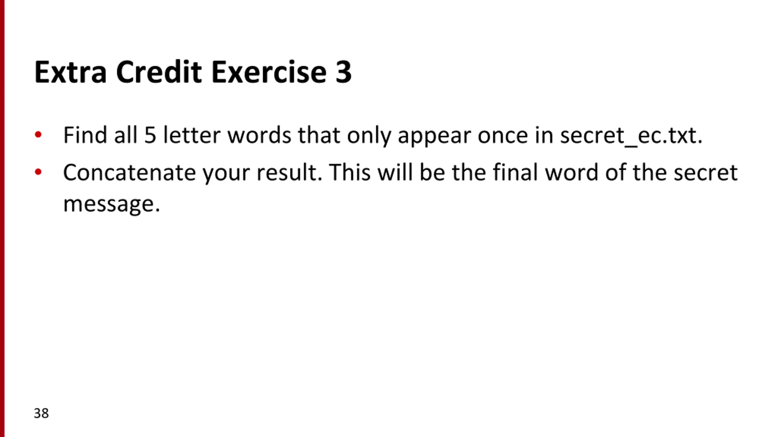 Extra Credit Exercise 3 Find all 5 letter words that only appear once in secret_ec.txt. Concatenate your result. This will be the final word of the secret message. 38
