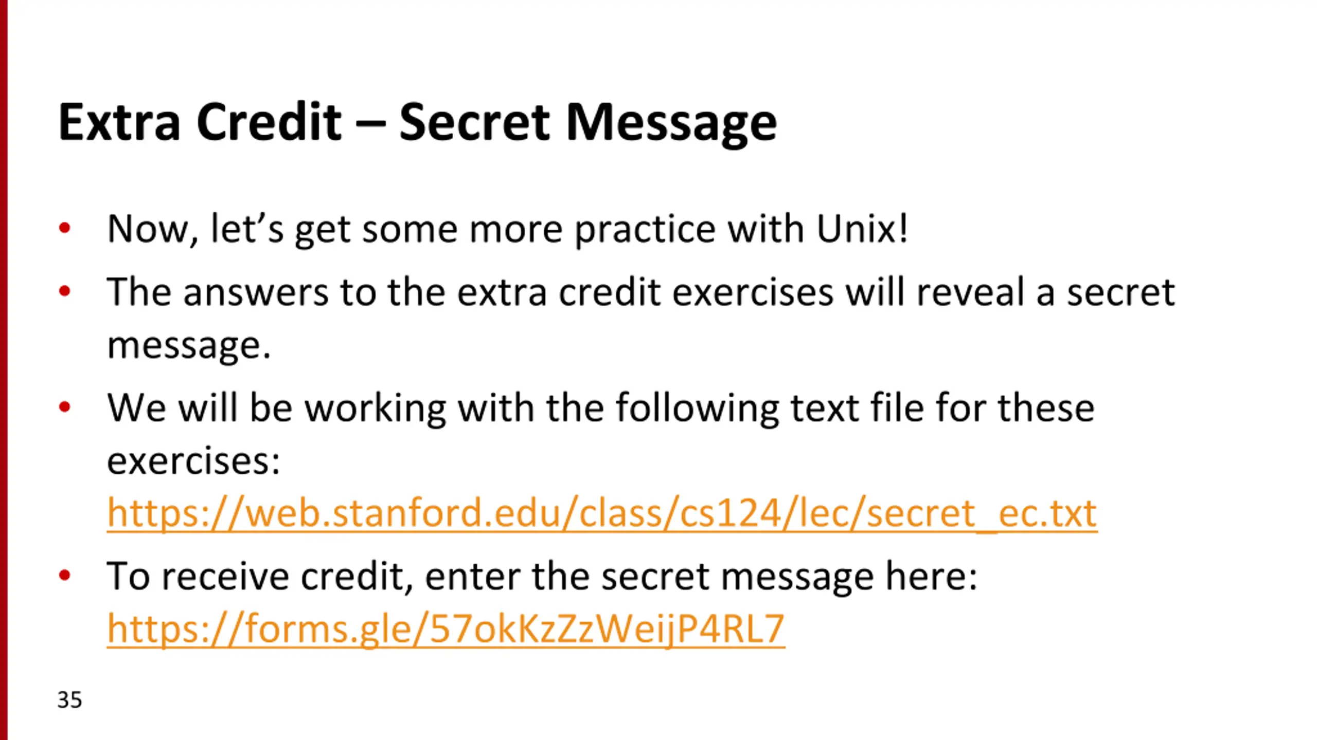 Extra Credit Secret Message Now, let s get some more practice with Unix! The answers to the extra credit exercises will reveal a secret message. We will be working with the following text file for these exercises: https://web.stanford.edu/class/cs124/lec/secret_ec.txt To receive credit, enter the secret message here: https://forms.gle/57okKzZzWeijP4RL7 35