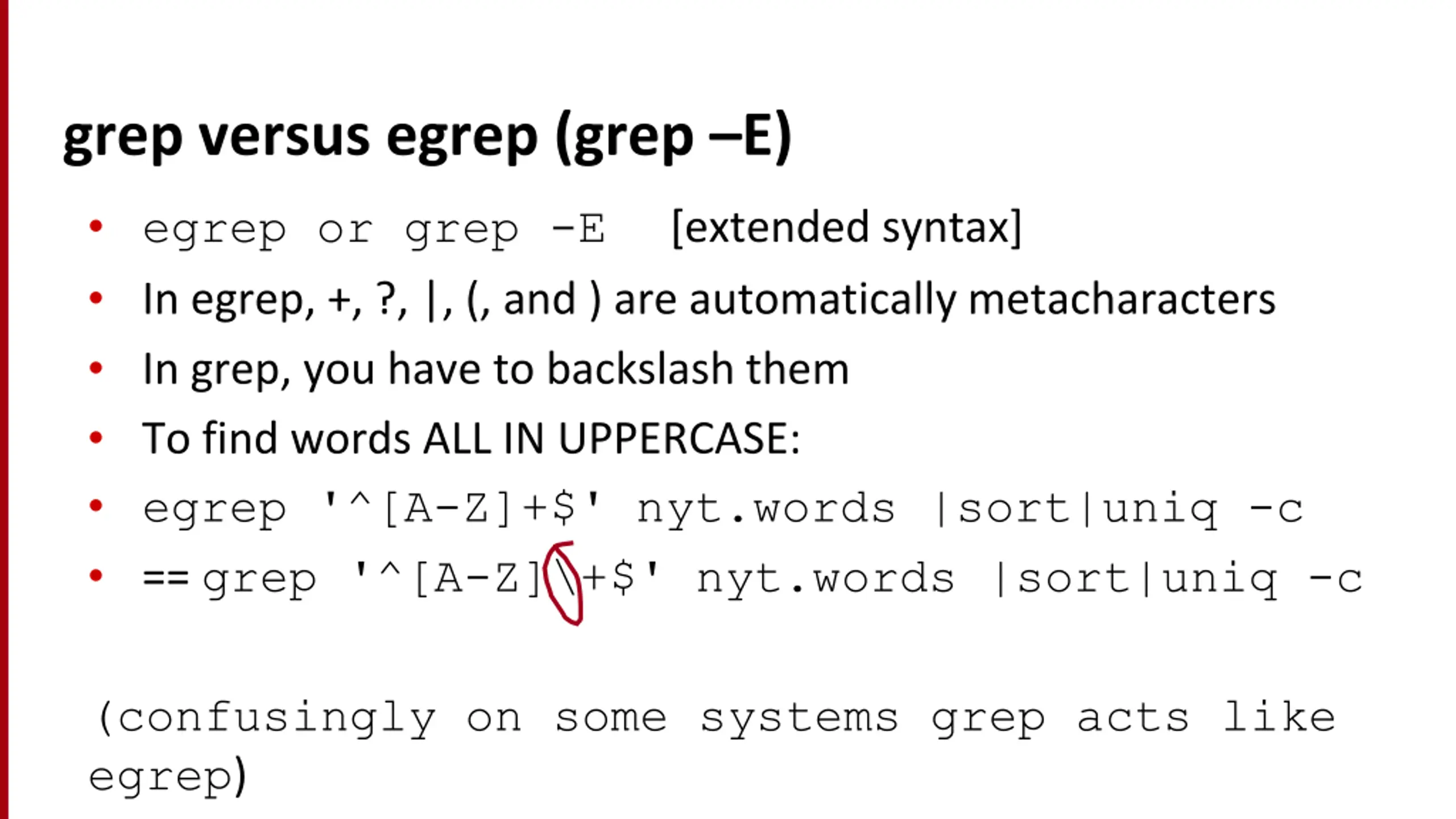 grep versus egrep (grep E) egrep or grep -E In egrep, +, ?, |, (, and ) are automatically metacharacters In grep, you have to backslash them To find words ALL IN UPPERCASE: egrep '^[A-Z]+$' nyt.words |sort|uniq -c == grep '^[A-Z]\+$' nyt.words |sort|uniq -c [extended syntax] (confusingly on some systems grep acts like egrep)