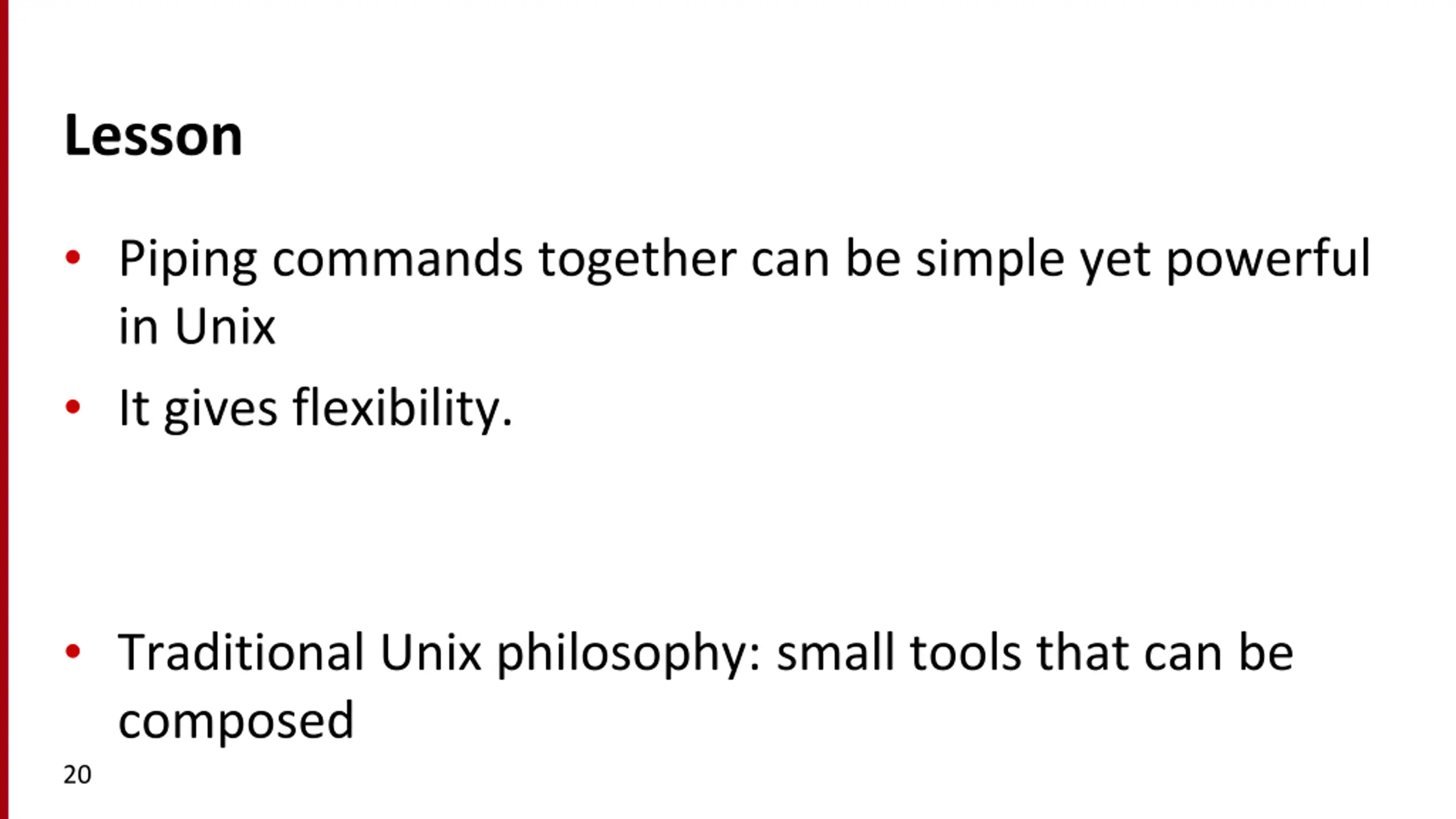 Lesson Piping commands together can be simple yet powerful in Unix It gives flexibility. Traditional Unix philosophy: small tools that can be composed 20