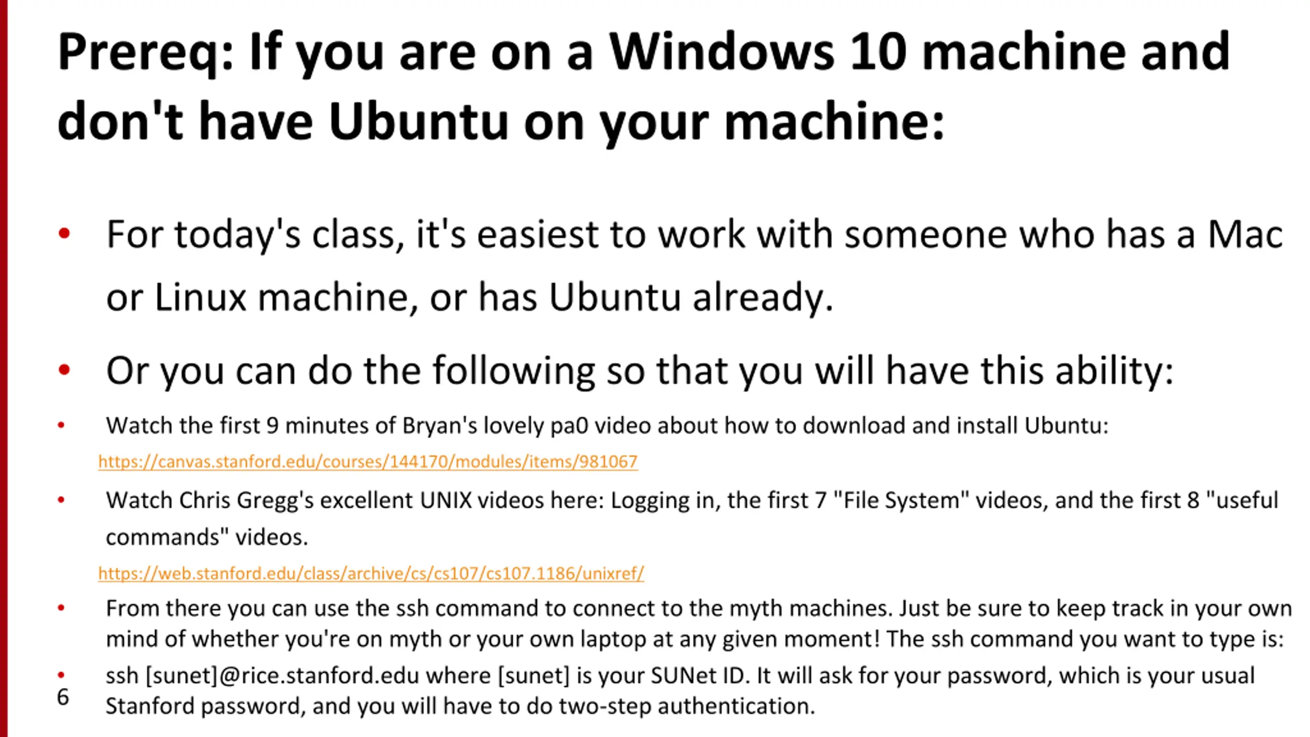 Prereq: If you are on a Windows 10 machine and don't have Ubuntu on your machine: For today's class, it's easiest to work with someone who has a Mac or Linux machine, or has Ubuntu already. Or you can do the following so that you will have this ability: Watch the first 9 minutes of Bryan's lovely pa0 video about how to download and install Ubuntu: https://canvas.stanford.edu/courses/144170/modules/items/981067 Watch Chris Gregg's excellent UNIX videos here: Logging in, the first 7 "File System" videos, and the first 8 "useful commands" videos. https://web.stanford.edu/class/archive/cs/cs107/cs107.1186/unixref/ From there you can use the ssh command to connect to the myth machines. Just be sure to keep track in your own mind of whether you're on myth or your own laptop at any given moment! The ssh command you want to type is: ssh [sunet]@rice.stanford.edu where [sunet] is your SUNet ID. It will ask for your password, which is your usual Stanford password, and you will have to do two-step authentication. 6