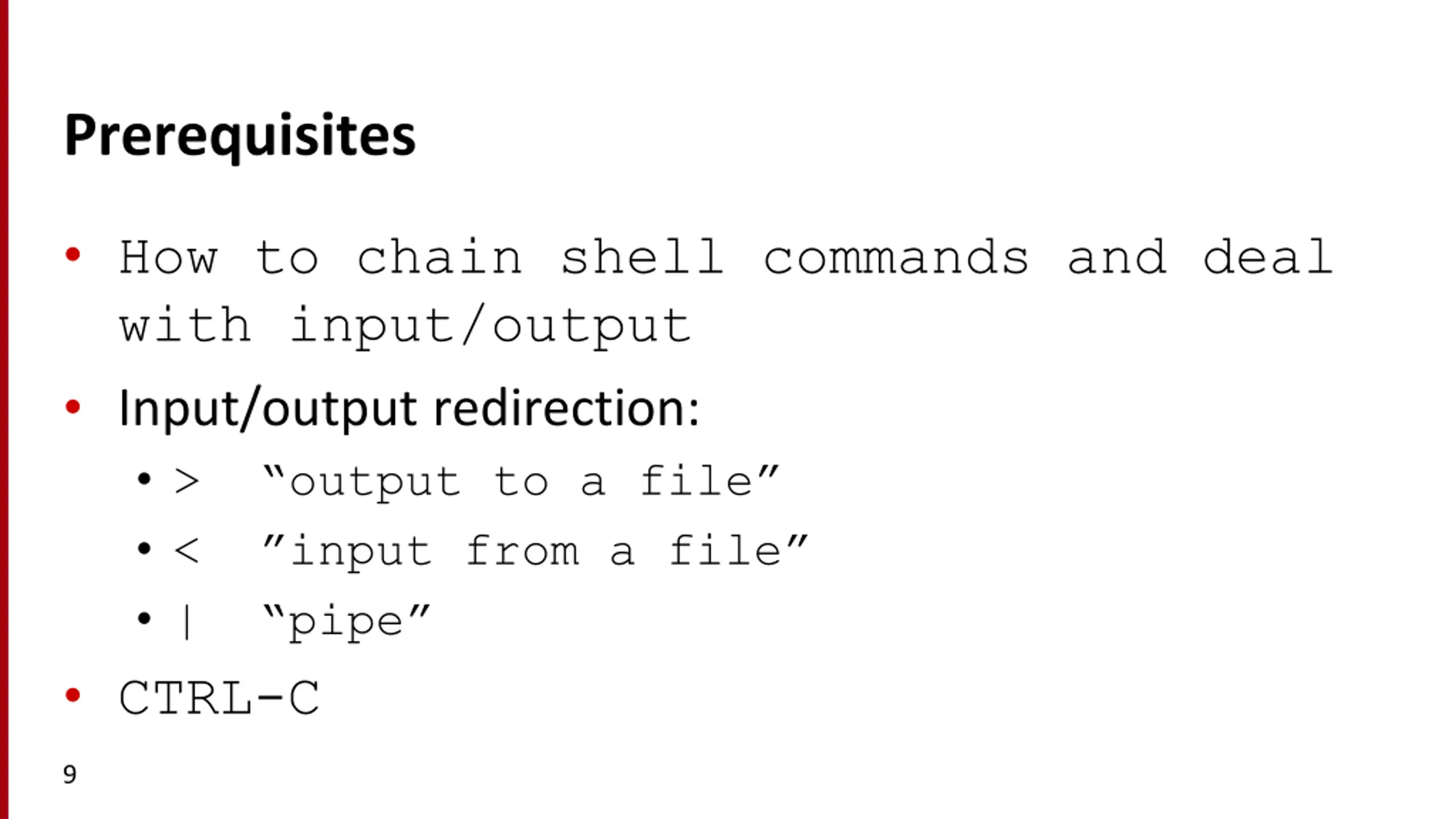 Prerequisites How to chain shell commands and deal with input/output Input/output redirection: > output to a file < input from a file | pipe CTRL-C 9