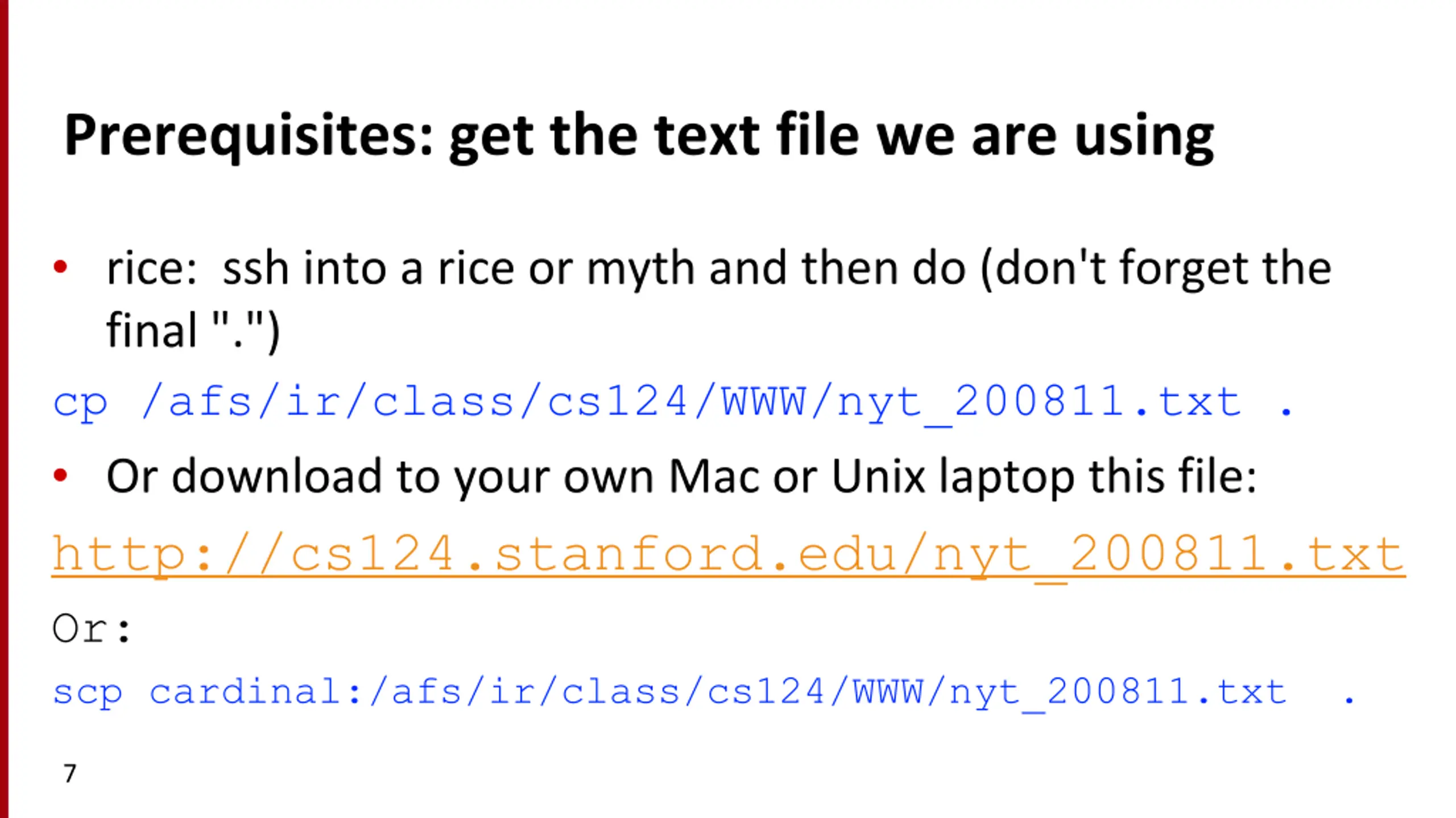 Prerequisites: get the text file we are using rice: ssh into a rice or myth and then do (don't forget the final ".") cp /afs/ir/class/cs124/WWW/nyt_200811.txt . Or download to your own Mac or Unix laptop this file: http://cs124.stanford.edu/nyt_200811.txt Or: scp cardinal:/afs/ir/class/cs124/WWW/nyt_200811.txt . 7