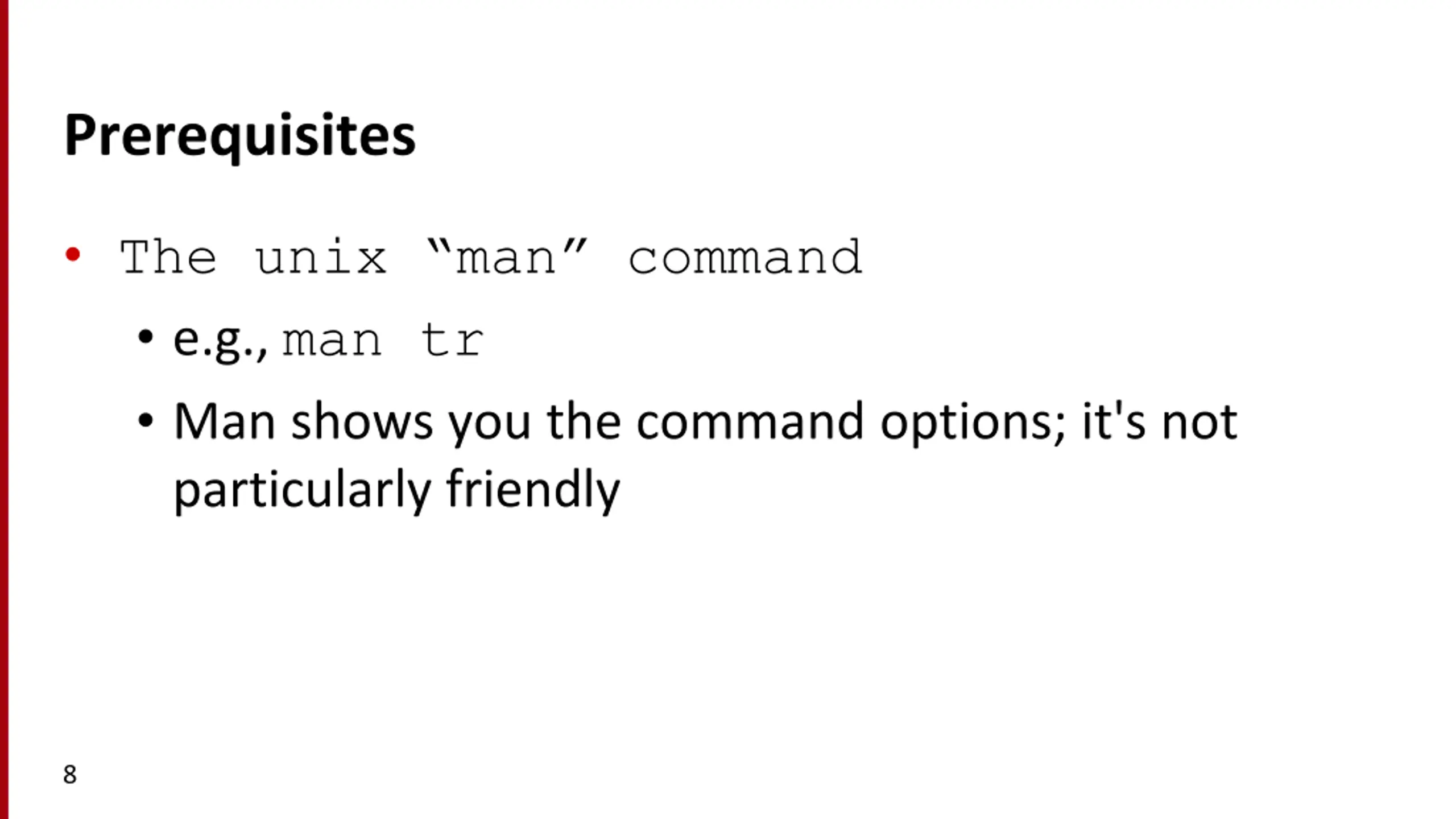 Prerequisites The unix man command e.g., man tr Man shows you the command options; it's not particularly friendly 8