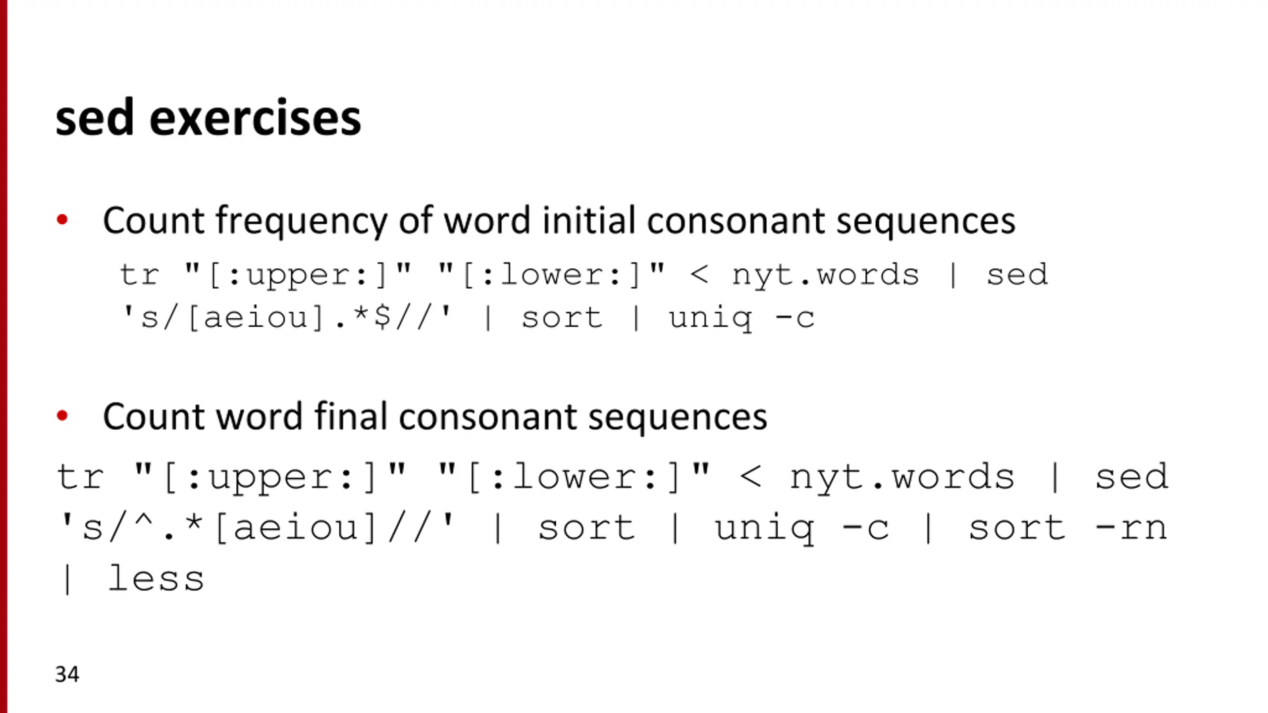sed exercises Count frequency of word initial consonant sequences tr "[:upper:]" "[:lower:]" < nyt.words | sed 's/[aeiou].*$//' | sort | uniq -c Count word final consonant sequences tr "[:upper:]" "[:lower:]" < nyt.words | sed 's/^.*[aeiou]//' | sort | uniq -c | sort -rn | less 34