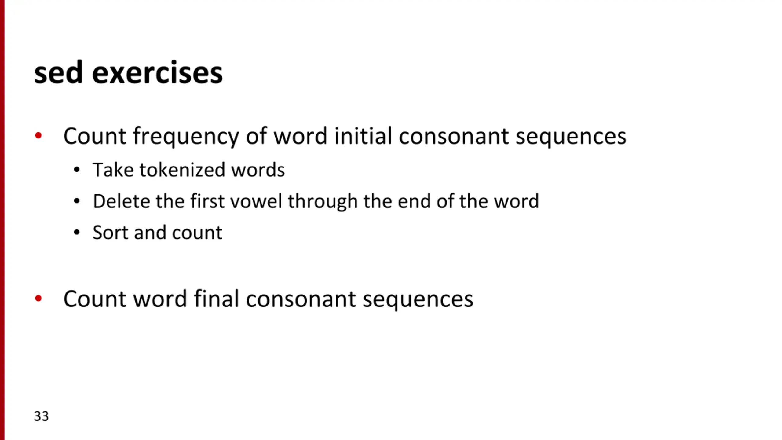 sed exercises Count frequency of word initial consonant sequences Take tokenized words Delete the first vowel through the end of the word Sort and count Count word final consonant sequences 33