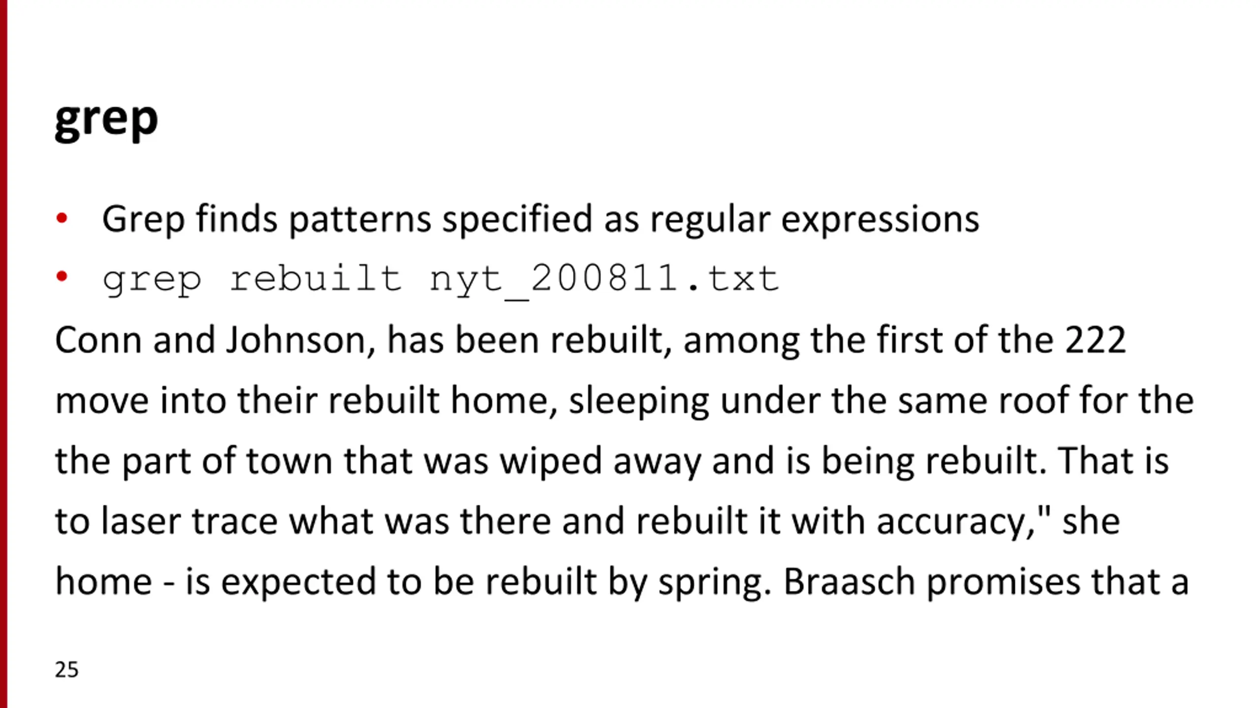 grep Grep finds patterns specified as regular expressions grep rebuilt nyt_200811.txt Conn and Johnson, has been rebuilt, among the first of the 222 move into their rebuilt home, sleeping under the same roof for the the part of town that was wiped away and is being rebuilt. That is to laser trace what was there and rebuilt it with accuracy," she home - is expected to be rebuilt by spring. Braasch promises that a 25
