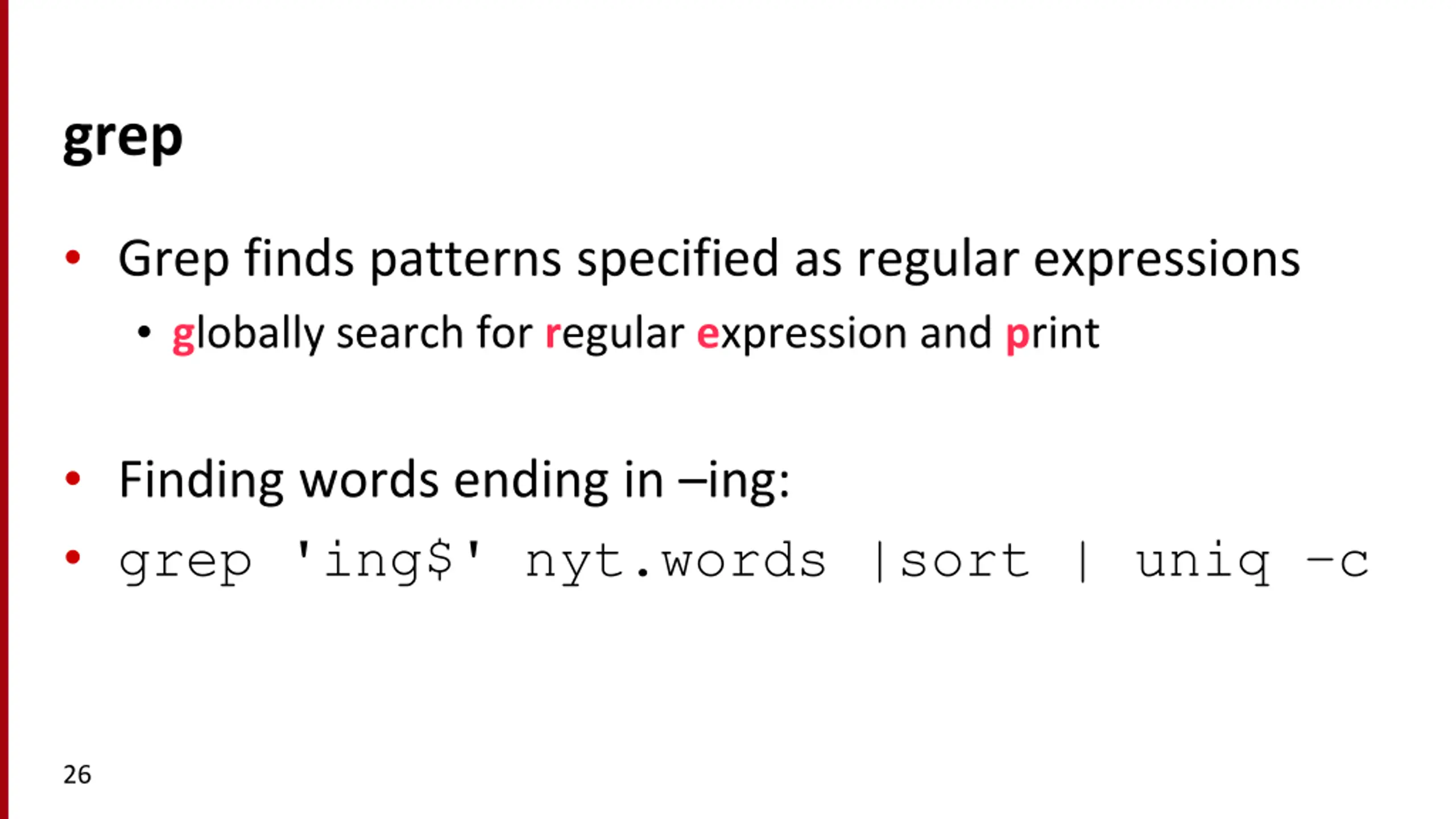 grep Grep finds patterns specified as regular expressions globally search for regular expression and print Finding words ending in ing: grep 'ing$' nyt.words |sort | uniq c 26